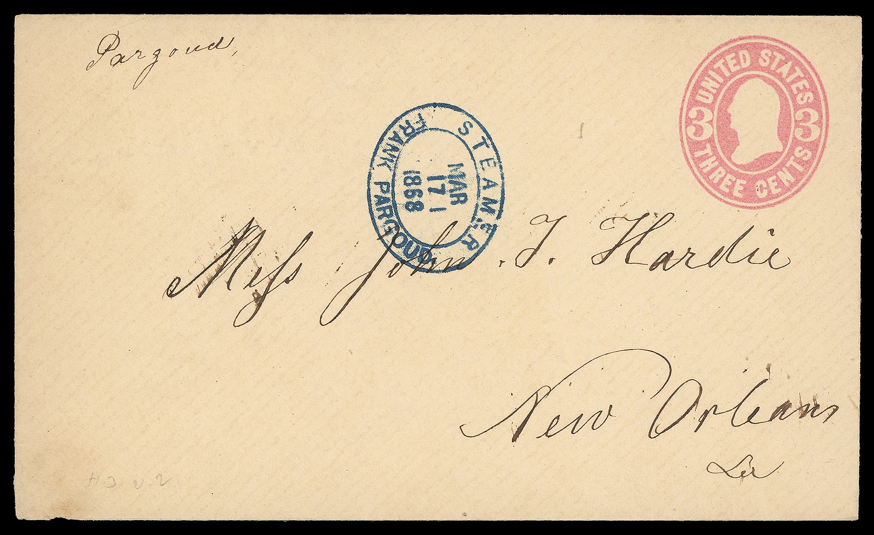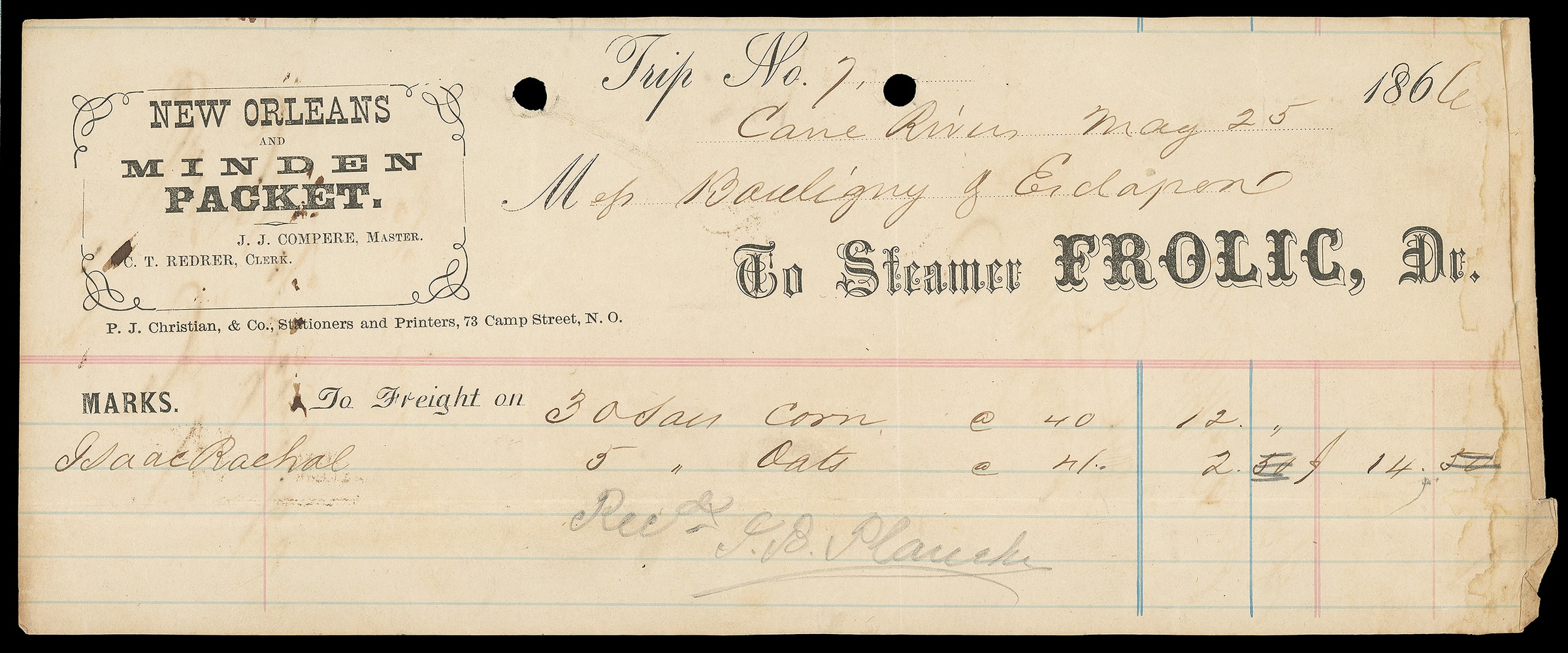 Frolic (Mississippi & Red Rivers). Blue oval handstamp on 3¢ pink (U58) entire from Hoy & Co. correspondence to New Orleans La., usual filing holes, plus black & green printed freight bill, F.-V.F. Milgram No. 484; Estimate $75 -