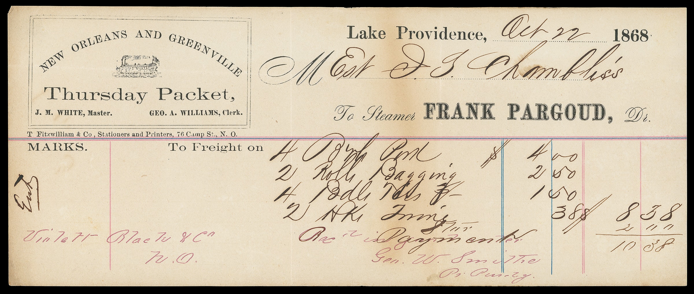 Pargoud (Mississippi River). Complete gem strike of blue "Mar 17, 1868" double oval handstamp on 3¢ pink (U59) buff entire to New Orleans La., also includes 1868 illustrated freight bill head, Very Fine and choice. Milgram No.