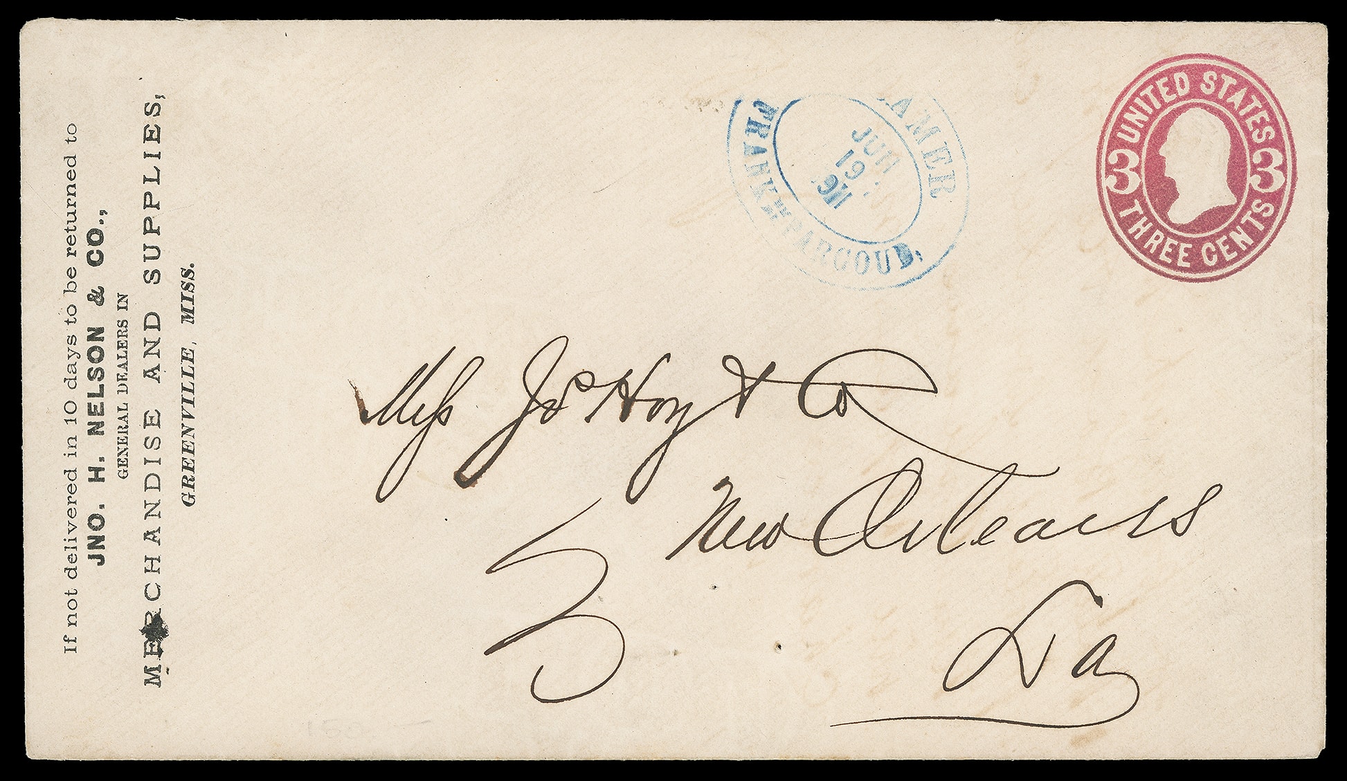 Pargoud (Mississippi River). Partial blue "Jun. 19" oval datestamp on 3¢ pink (U58) entire with Jno. H. Nelson & Co., Greenville, Mississippi to New Orleans La. marking, F.-V.F. Milgram No. 479; Estimate $50 - 75.