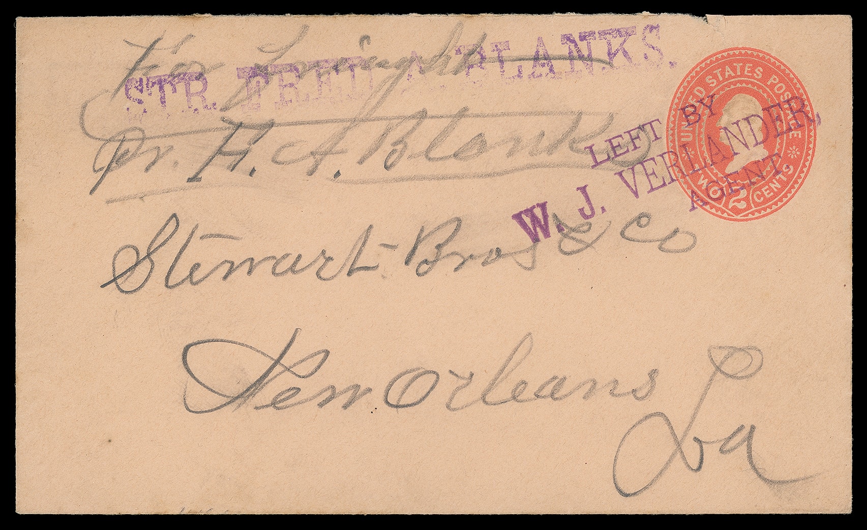 Blanks (Ouachita River). Purple straightline and additional matching "Left By W.J. Verlander Agent" three-line handstamp on 2¢ red entire to New Orleans La., pencil endorsement "For Freight, pr. F.A. Blanks", V, Very Fine, unlisted in