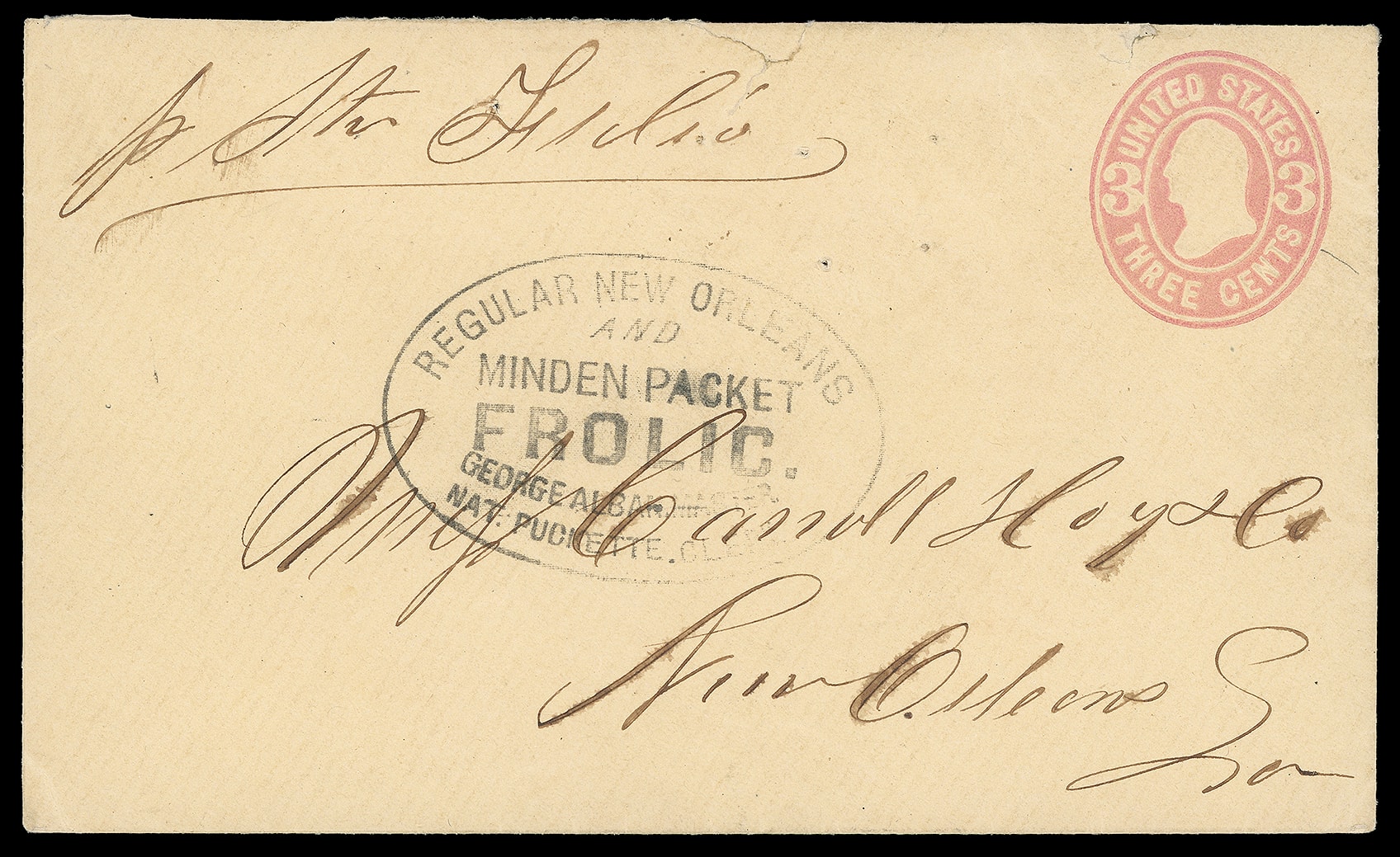 and Minden Packet Frolic (Mississippi River & Bayou La Fourche). Oval handstamp on 3¢ pink (U59) buff entire to New Orleans La.; small tear at top, plus printed 1866 freight bill head, otherwise Very Fine, F.-V.F. Milgram No. 483;