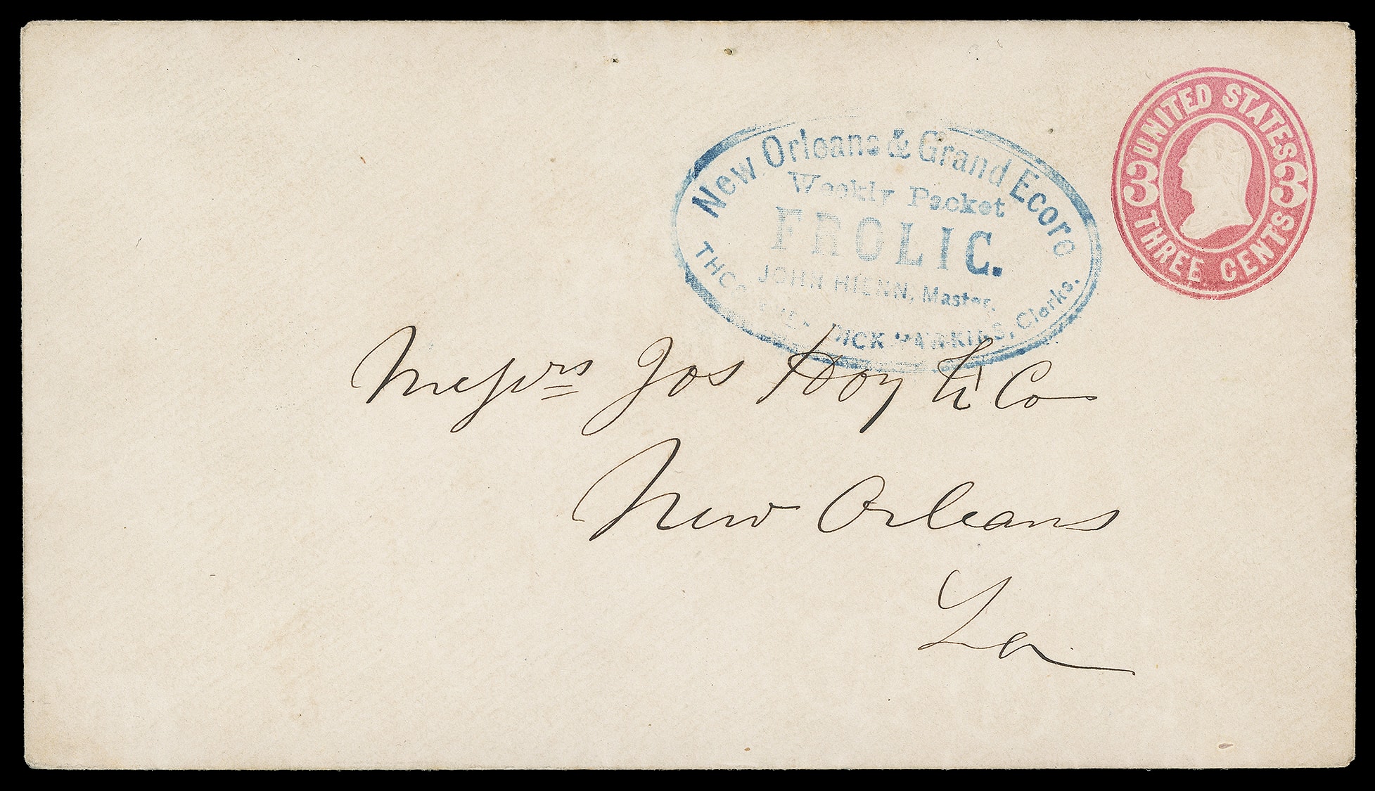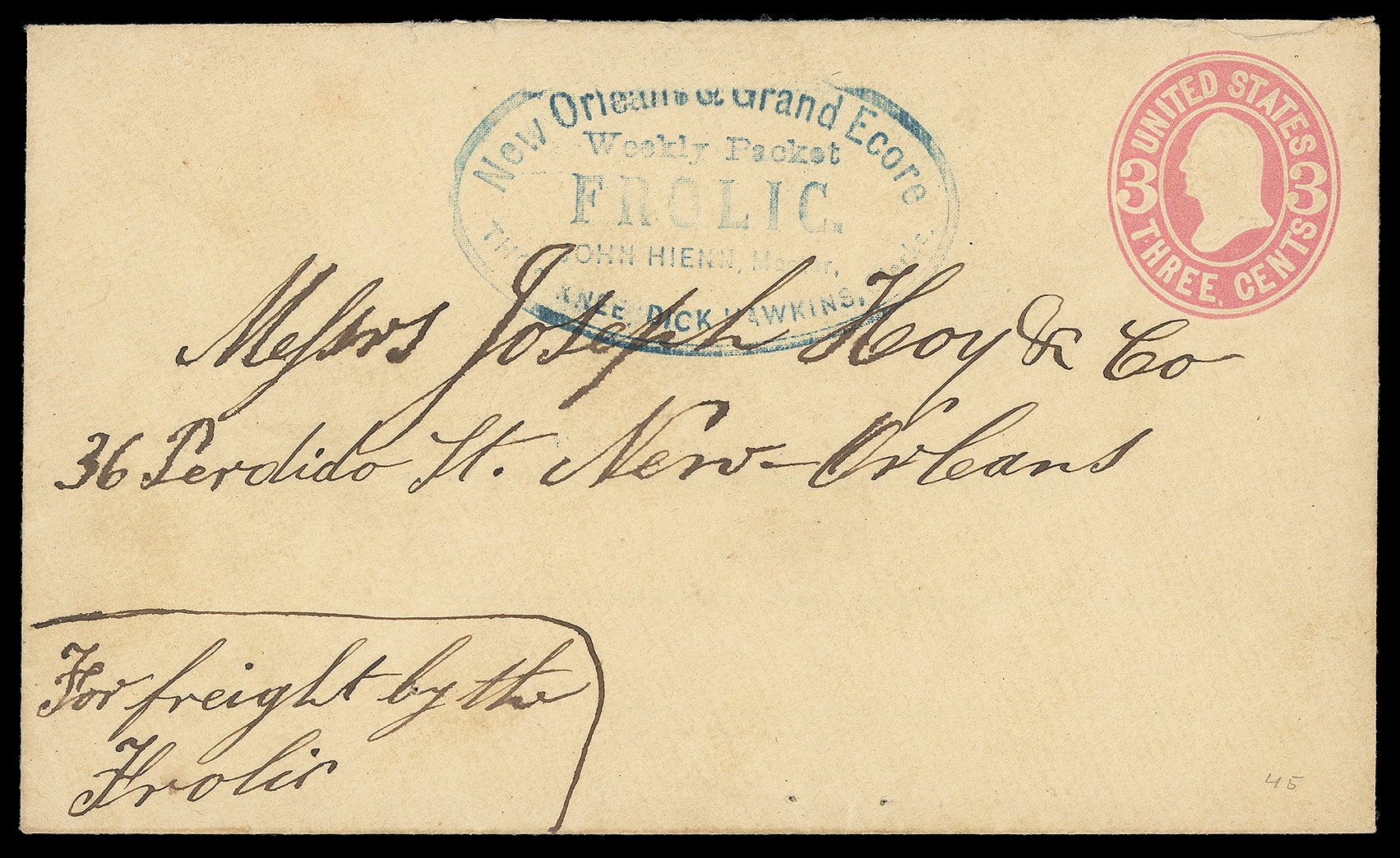 Frolic (Mississippi & Red Rivers). Blue oval handstamp on 3¢ red (U59) buff entire to New Orleans La., endorsement "For freight by the Frolic" at bottom left; minor flap tear, Very Fine. Milgram No. 484 Estimate $150 - 200., Very Fine
