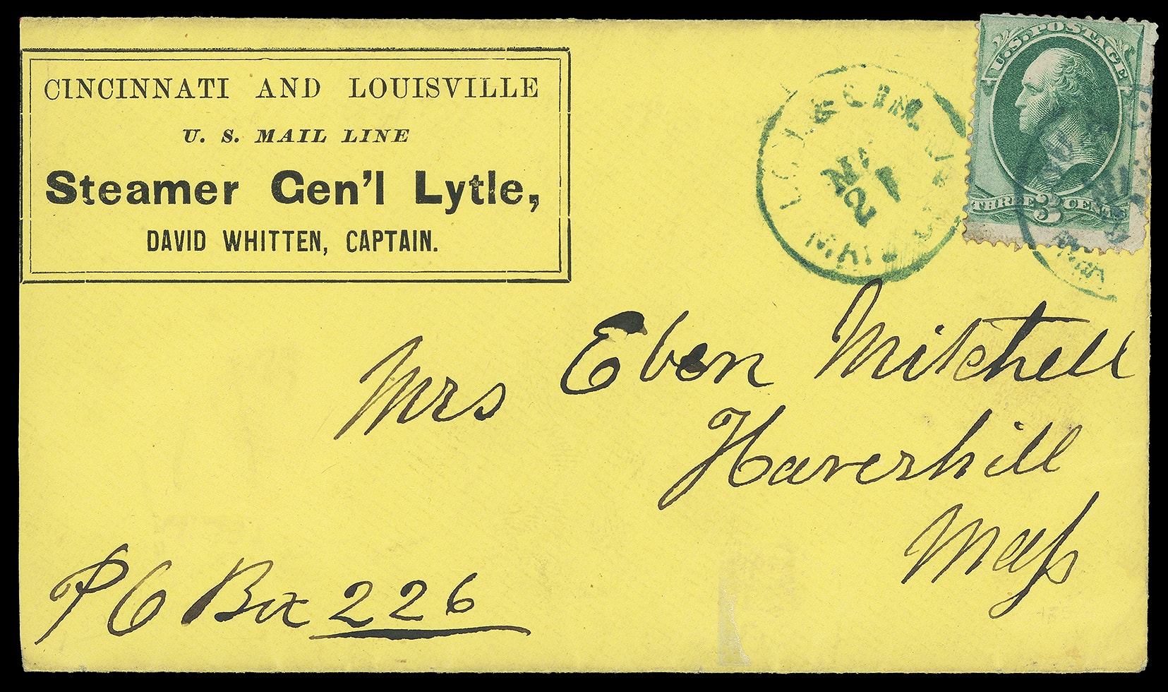Louisville U.S. Mail Line Steamer Gen'l Lytle (Ohio River). Printed corner card on lemon cover bearing 3¢ green (147), small flaws, tied by blue "Lou. & Cin. Mail Line, Mar 21" route agent cds to Haverhill, Mass.; reduced slightly at left,