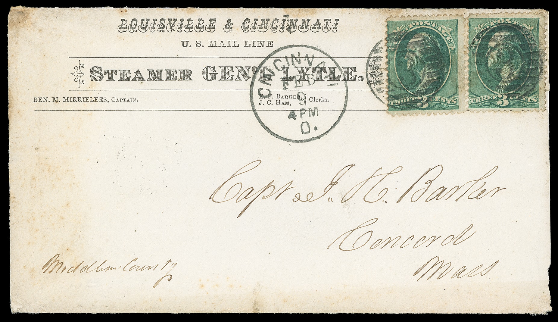 Cincinnati U.S. Mail Line Steam Gen'l Lytle (Ohio River). Printed corner card across top of cover bearing 3¢ green (207) pair tied by "3" barred circles duplexed with "Cincinnati O. Feb 9" cds to Concord, Mass.; minor toning, slightly