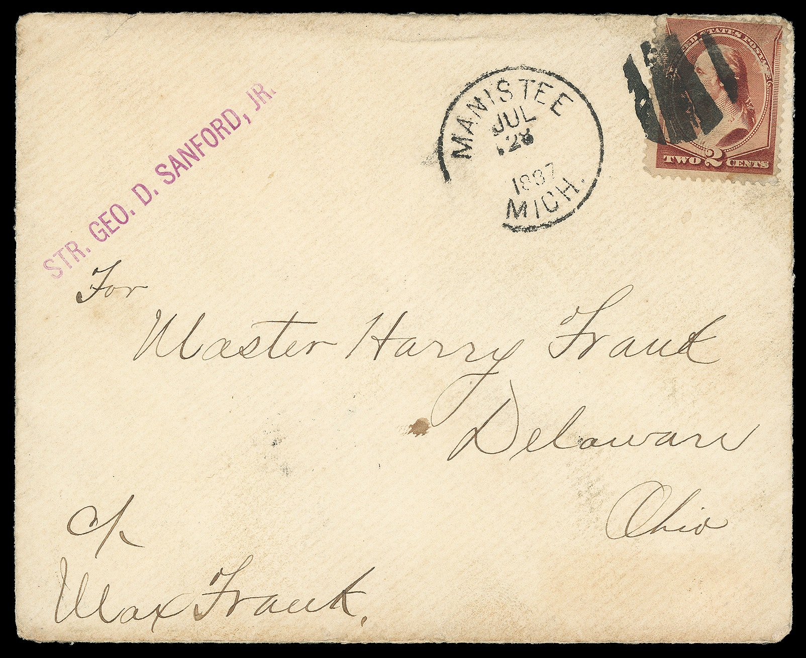 Stanford, Jr. (Great Lakes). Violet straight line handstamp on cover bearing 2¢ red brown (210), small flaws, tied by grid cancel duplexed with "Manistee, Mich. Jul. 28, 1897" cds to Delaware, Ohio; edge wear, Very Fine and scarce