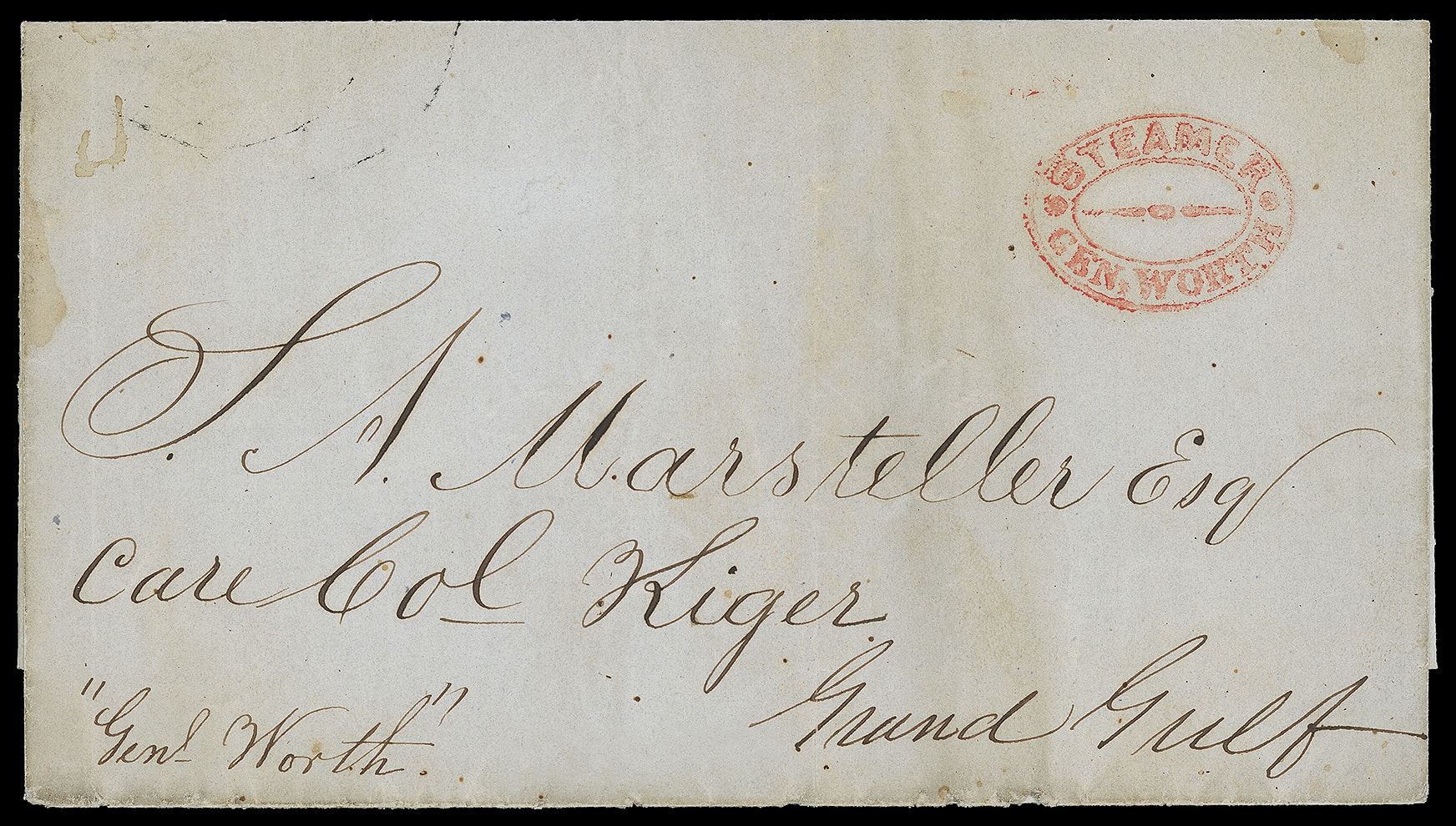 Worth. Red oval handstamp on gray folded cover to Grand Gulf, endorsed "Genl Worth" at bottom left; cover refolded, Very Fine strike, ex-Haas, Milgram. Milgram No. 507; Estimate $200 - 300. (Image1)