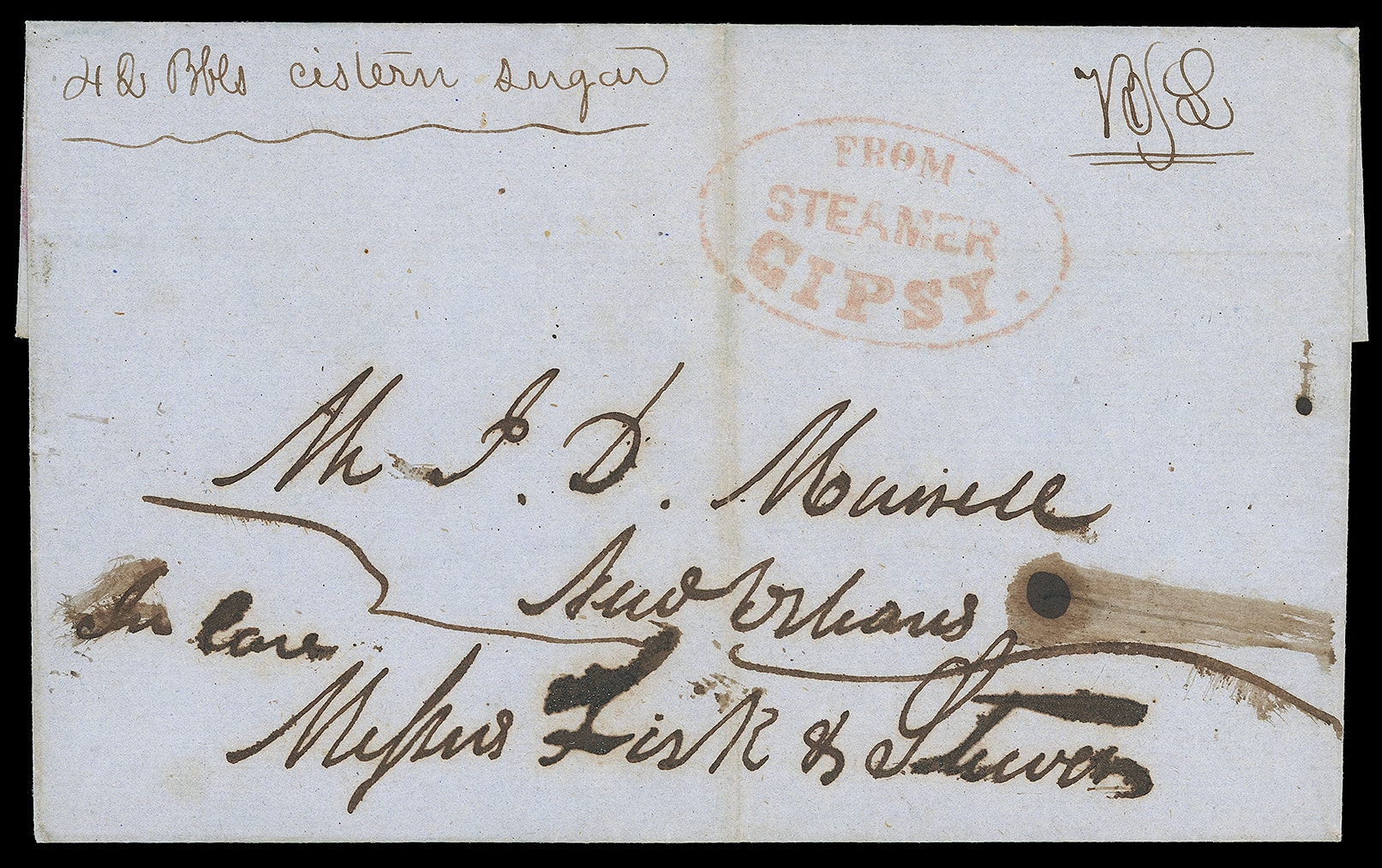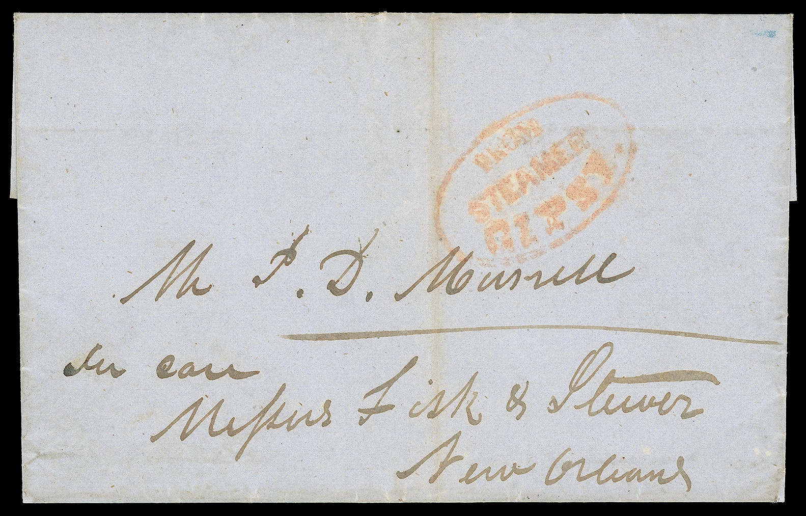 (Mississippi River). Red and orange strikes of oval handstamps on two 1849 folded covers from the same correspondence to New Orleans La., one endorsed "42 Bbls cistern sugar", both vertical file fold, otherwise Very Fine. Milgram No.
