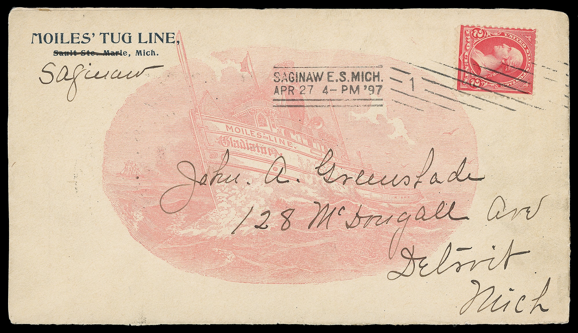 Gladiator (Great Lakes). Overall red illustrated design showing Moiles' Line Gladiator on 1897 cover bearing 2¢ carmine (279B) tied by "Saginaw E.S. Mich. Apr 27 '97" machine cancel to Detroit, Mich., most transit with