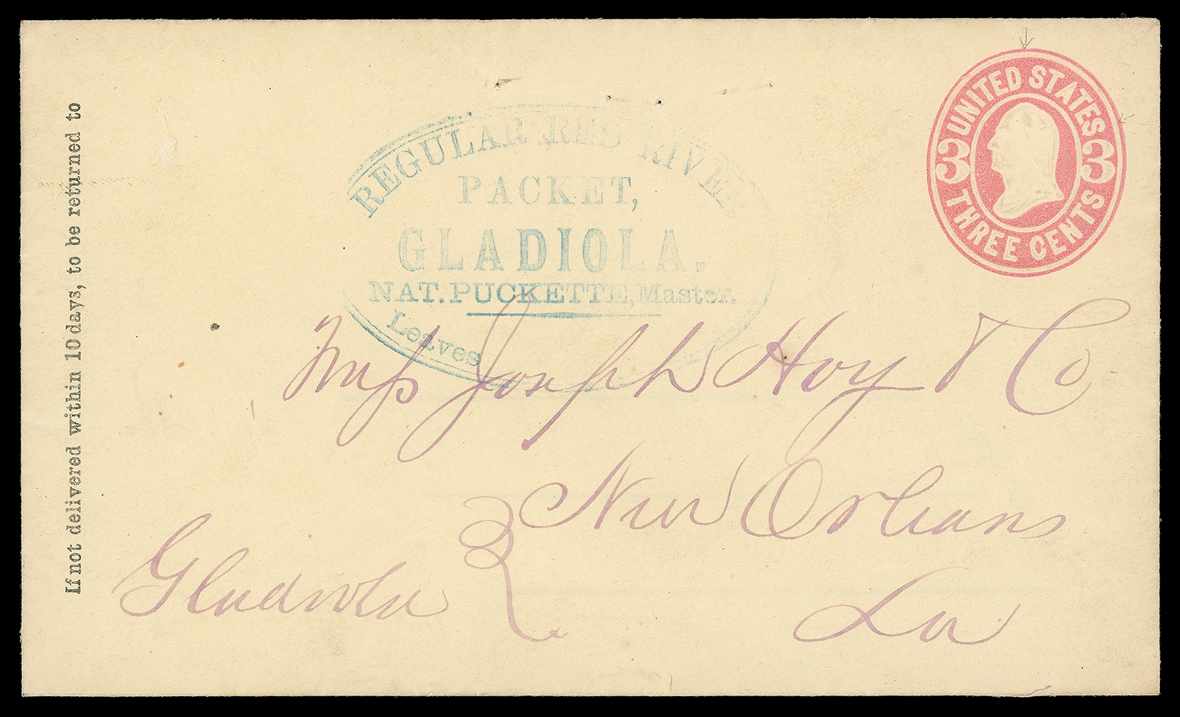 Packet Gladiola, Nat. Puckette, Master. (Red River). Blue oval handstamp on 3¢ pink (U59) buff entire from the Hoy & Co. correspondence to New Orleans La.; usual filing holes, F.-V.F. Milgram No. 514; Estimate $50 - 75. (Image1)