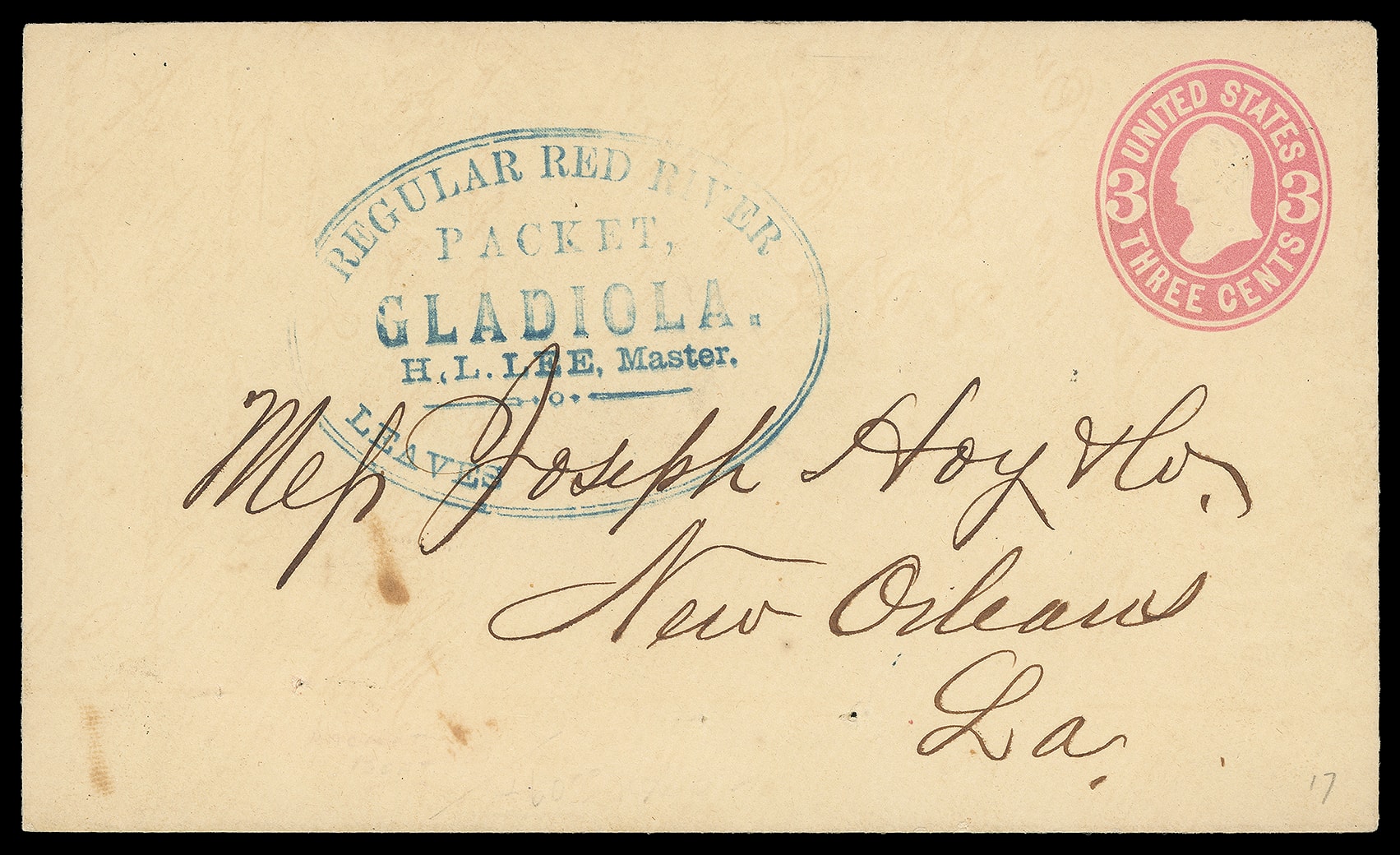 Packet Gladiola, H.L. Lee, Master (Red River). Bold blue oval handstamp on 3¢ pink (U59) buff entire from the Hoy & Co. correspondence to New Orleans La.; couple light tone spots and typical filing holes, Very Fine and choice strike,
