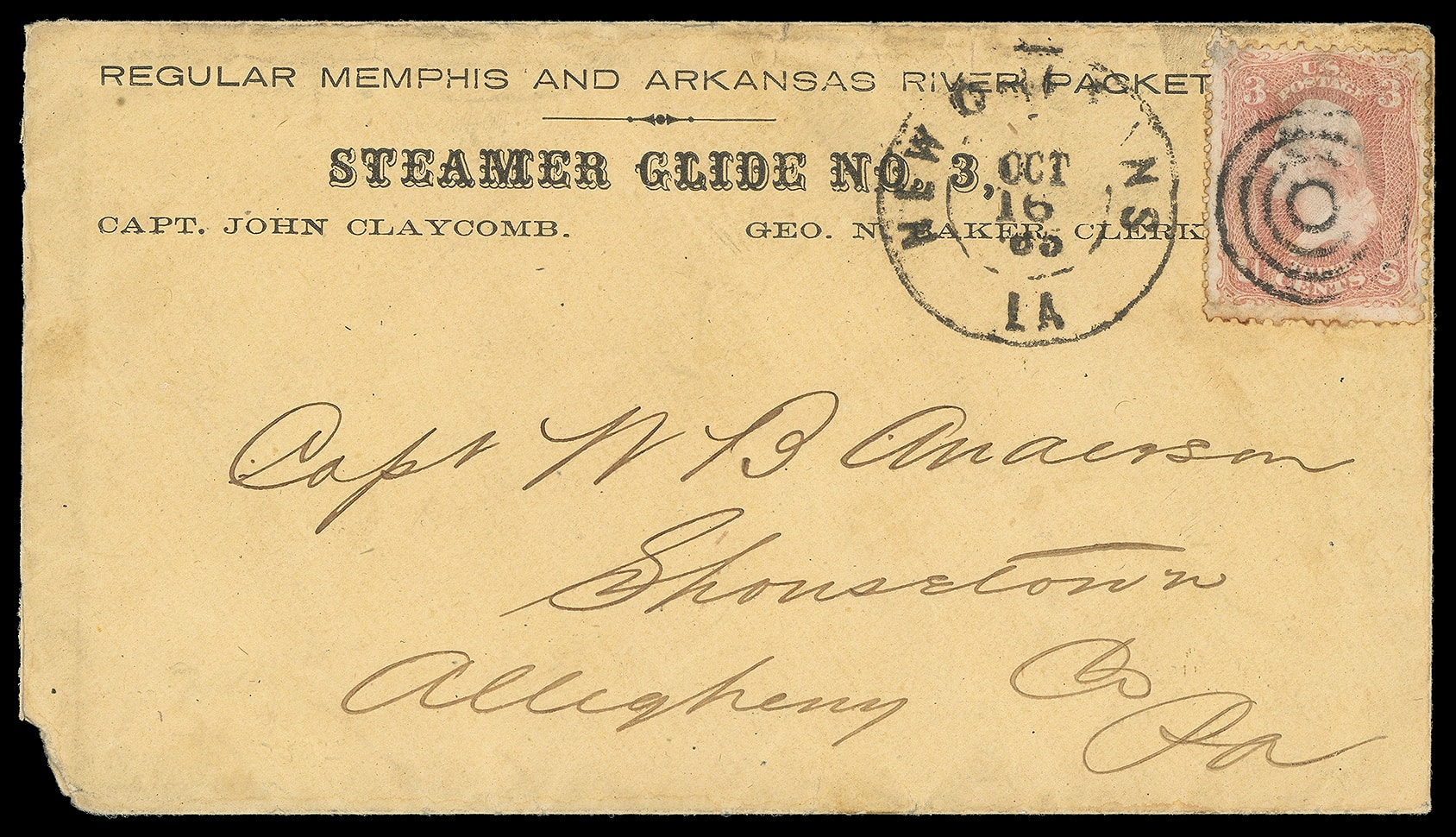Arkansas River Packet Steamer Glide No. 3 (Mississippi and Arkansas Rivers). Printed corner card across top of cover on 1865 buff cover bearing 3¢ rose (65) canceled by four-ring target duplexed with "New Orleans La., Oct 16 '65" cds to