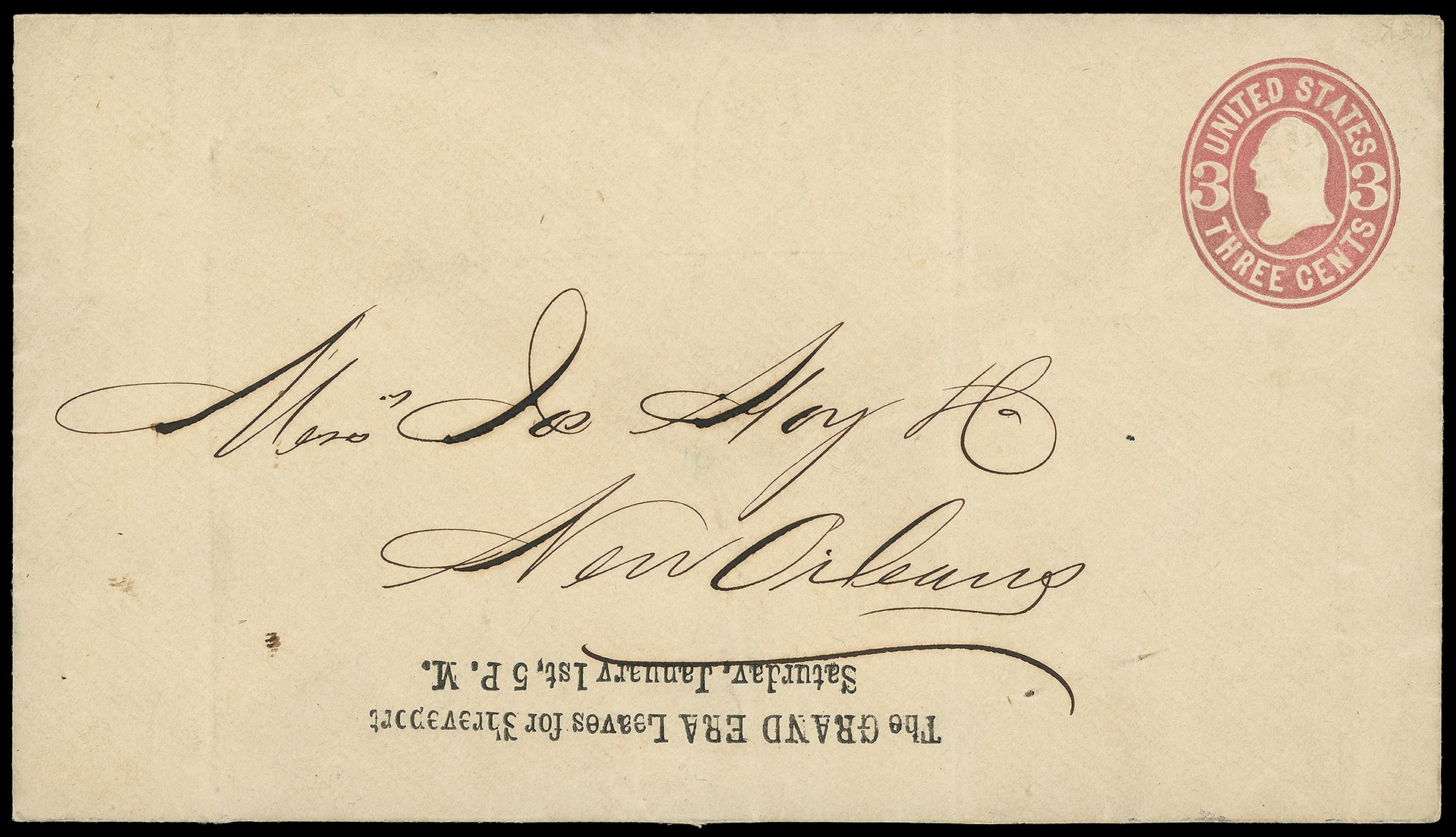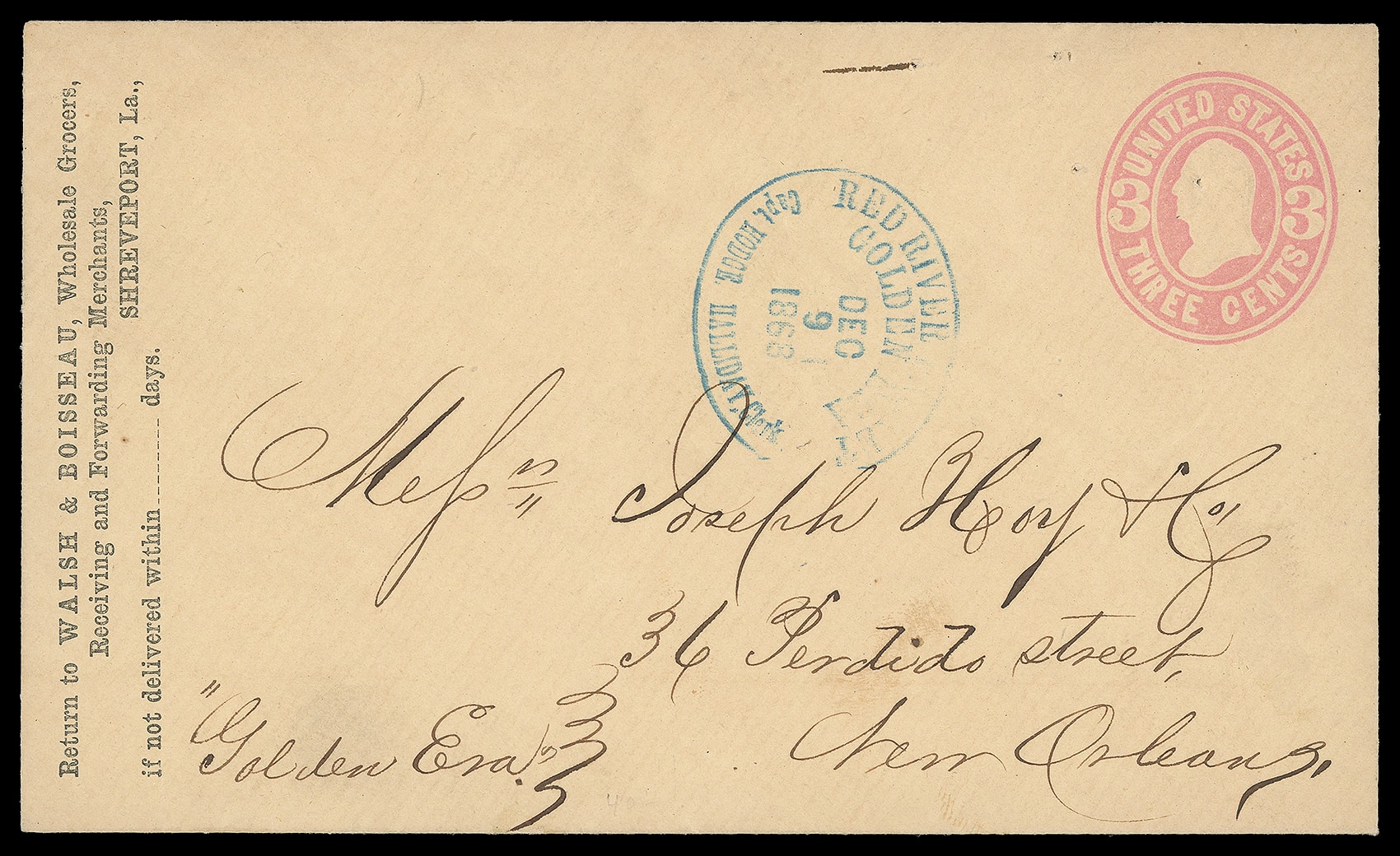 Golden Era. Blue oval "Dec 9, 1868" datestamp on 3¢ pink (U59) buff entire from Hoy & Co. correspondence with left "Walsh & Boisseau, Wholesale Grocers, Shreveport La." corner card to New Orleans La., endorsed "Golden Era" at bottom left;