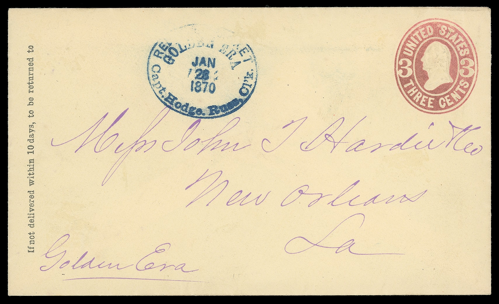 Golden Era. Bold blue "Jan. 28, 1870" oval datestamp on 3¢ pink (U59) buff entire from the Hardin & Co. correspondence to New Orleans, endorsed "Golden Era" at bottom left, fresh and Very Fine. Milgram No. 528; Estimate $75 -