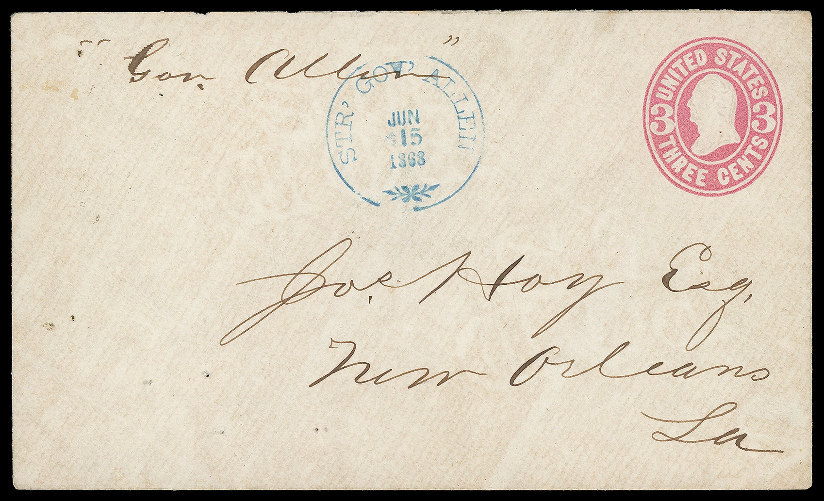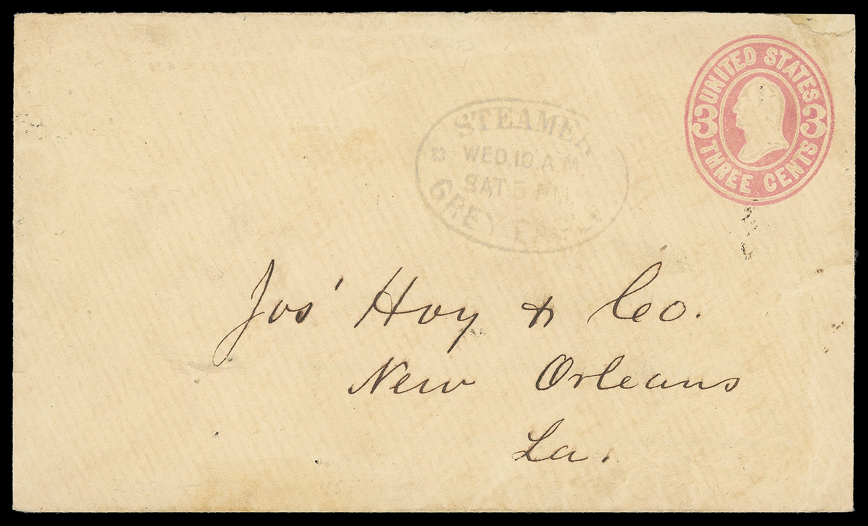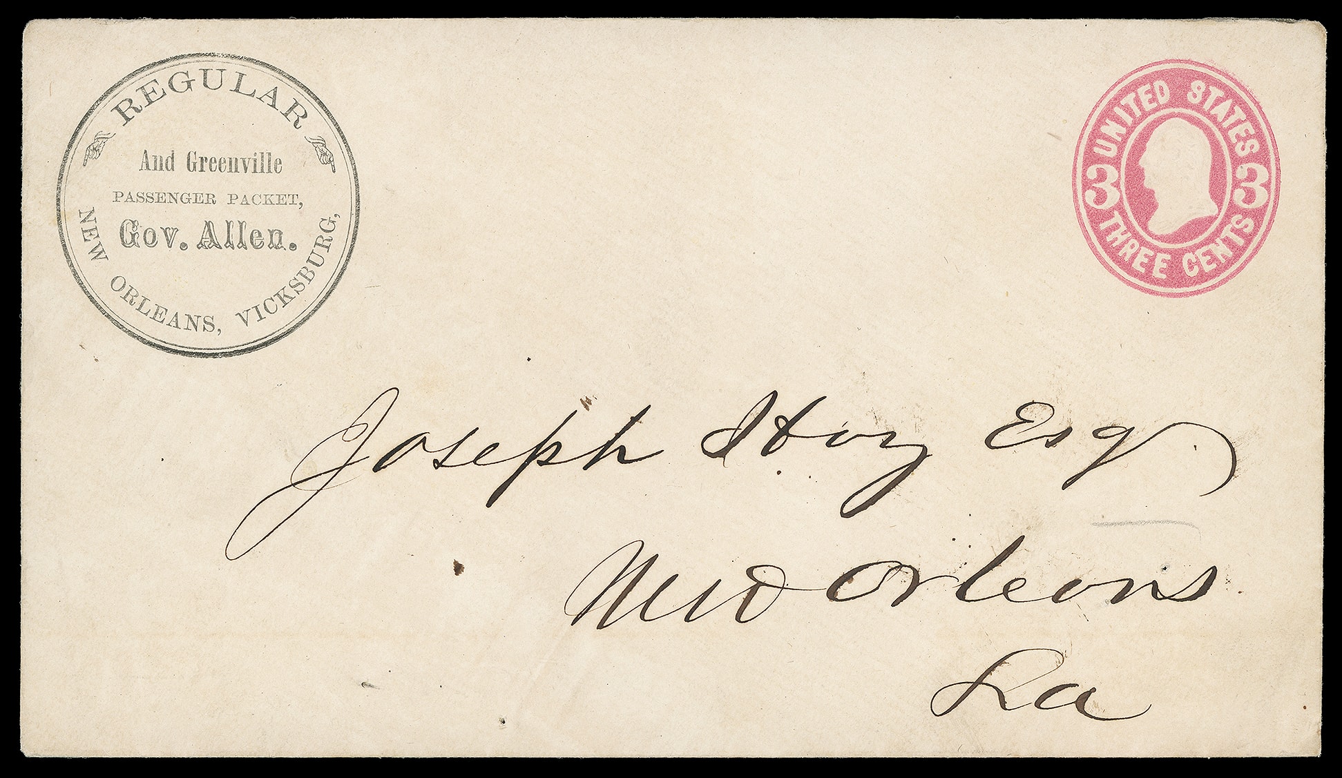 Orleans, Vicksburg And Greenville Passenger Packet Gov. Allen (Mississippi River). Printed circular corner card on 3¢ pink (U58) entire from the Hoy & Co. correspondence to New Orleans La.; usual filing holes, Extremely Fine and