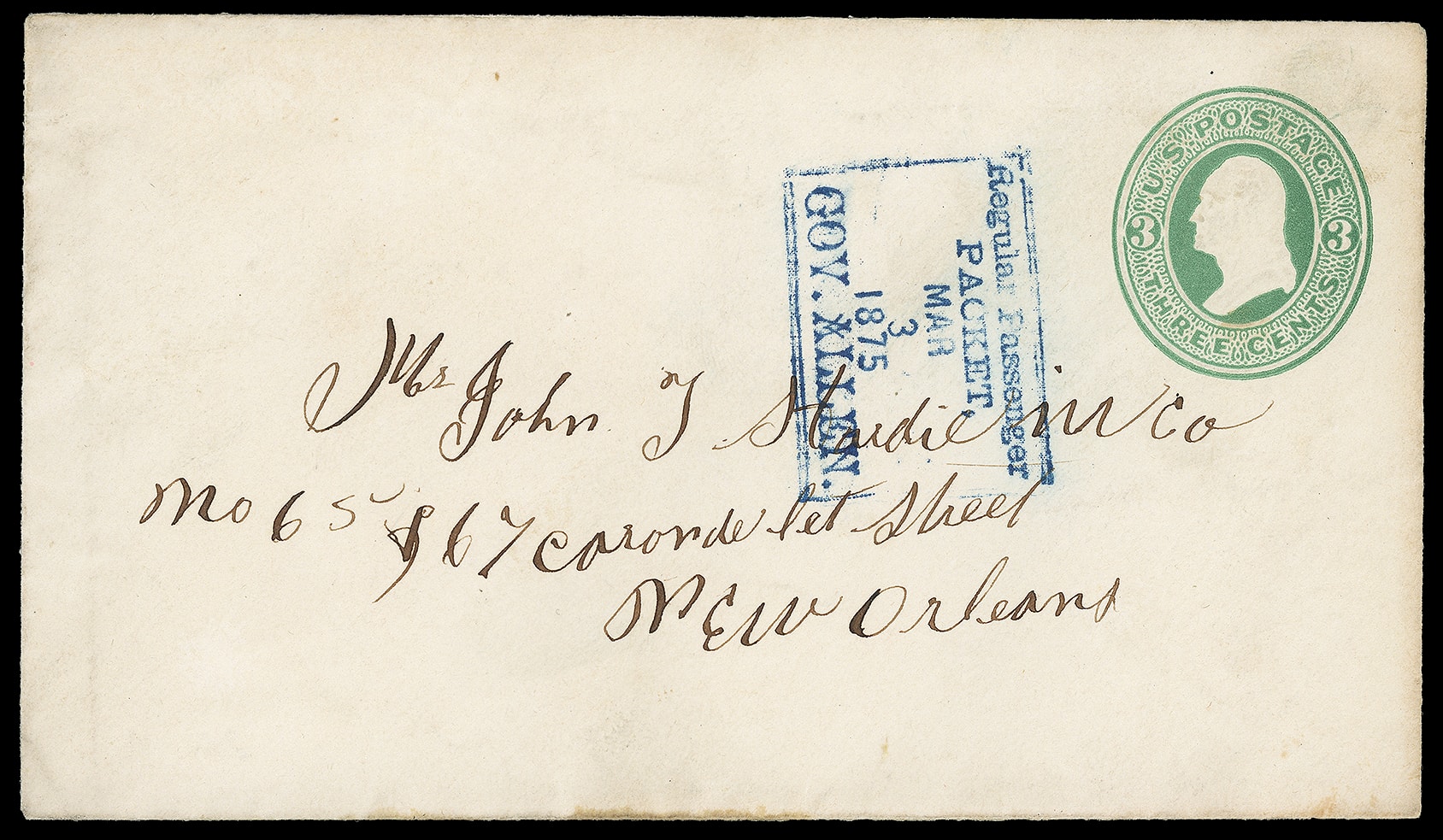 Packet Gov. Allen (Mississippi River). Complete blue "Mar 3, 1875" boxed rectangular datestamp on 3¢ green (U82) entire to New Orleans, La., also included is a 1878 printed freight bill head, Very Fine and choice. Milgram No. 536;