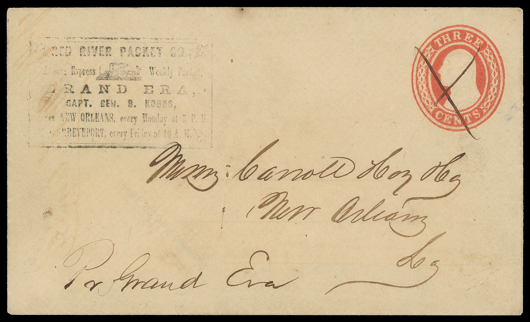 (Mississippi & Red Rivers). Well-struck illustrated handstamp featuring a steamboat on 3¢ red (U9) entire canceled by ms. "X" from the Carroll Hoy & Co. correspondence to New Orleans La.; typical filing holes, ex-Somdal,