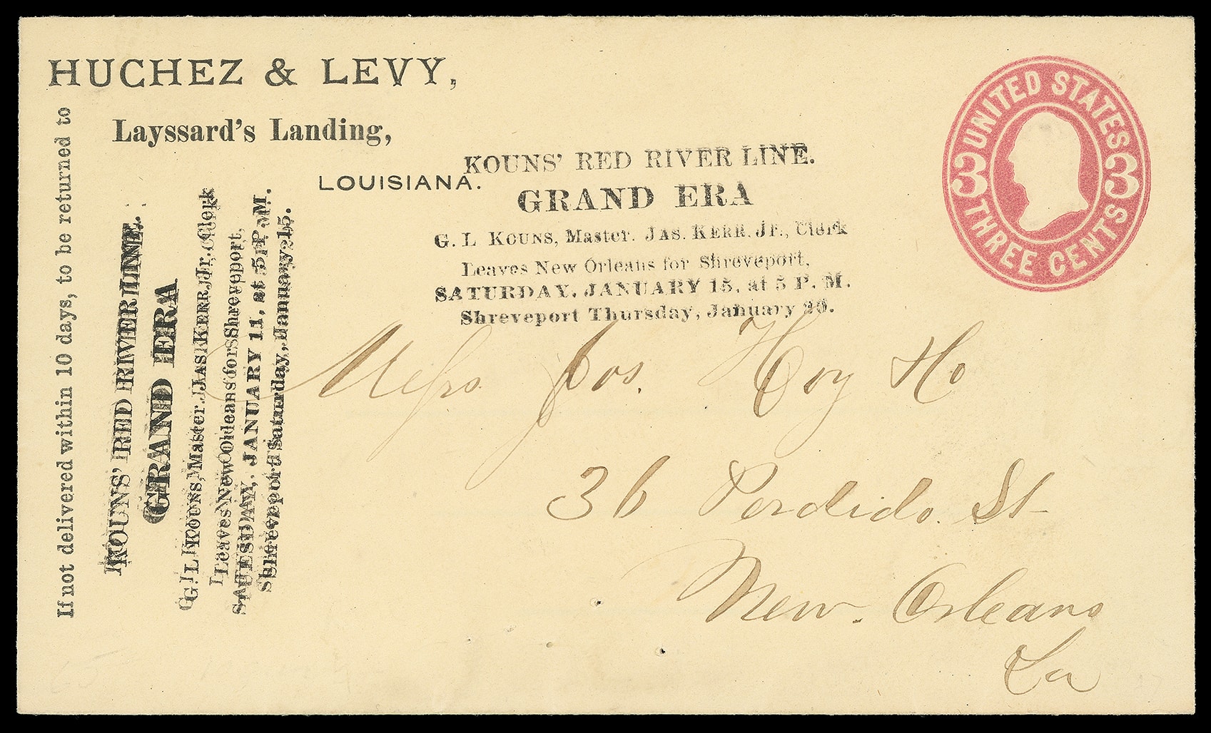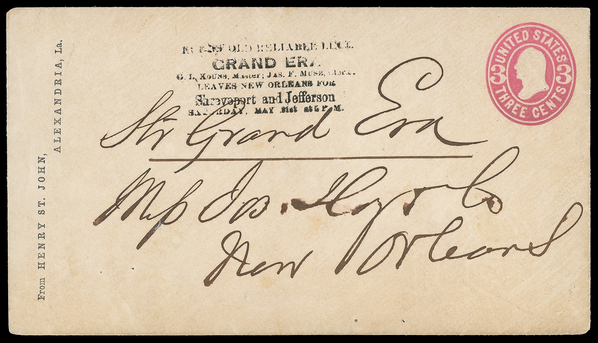 River). Six-line handstamp on 3¢ pink (U58) entire with "Henry St. John, Alexandria, La." at left from the Hoy & Co. correspondence to New Orleans La., Very Fine and choice strike that is rarely found this legible. Milgram No.
