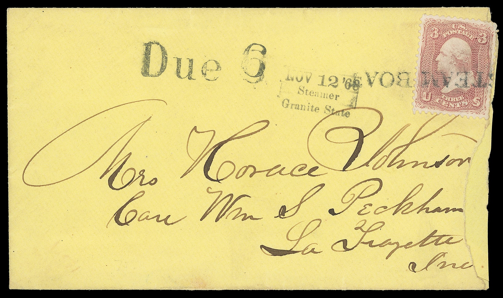 State (Long Island Sound). Three-line "Nov 12 '64" datestamp on 1864 yellow cover to Lafayette, Ind. bearing 3¢ rose (65) tied by New York "Steamboat" straightline, matching "Due 6" handstamp alongside; roughly opened with piece out at