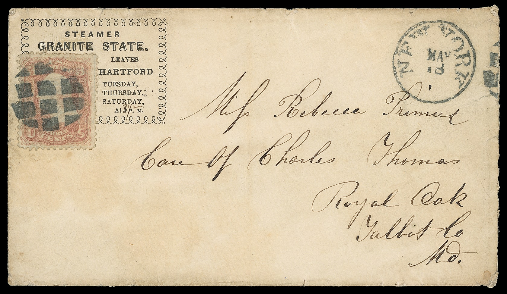 State (Long Island Sound). Ornate boxed corner card on cover bearing 3¢ rose (65), some short perfs, tied by circular segmented grid cancel, matching "New York, May 18" cds to Royal Oak, Md.; docketed "Rec'd May 22, 1866" on reverse;