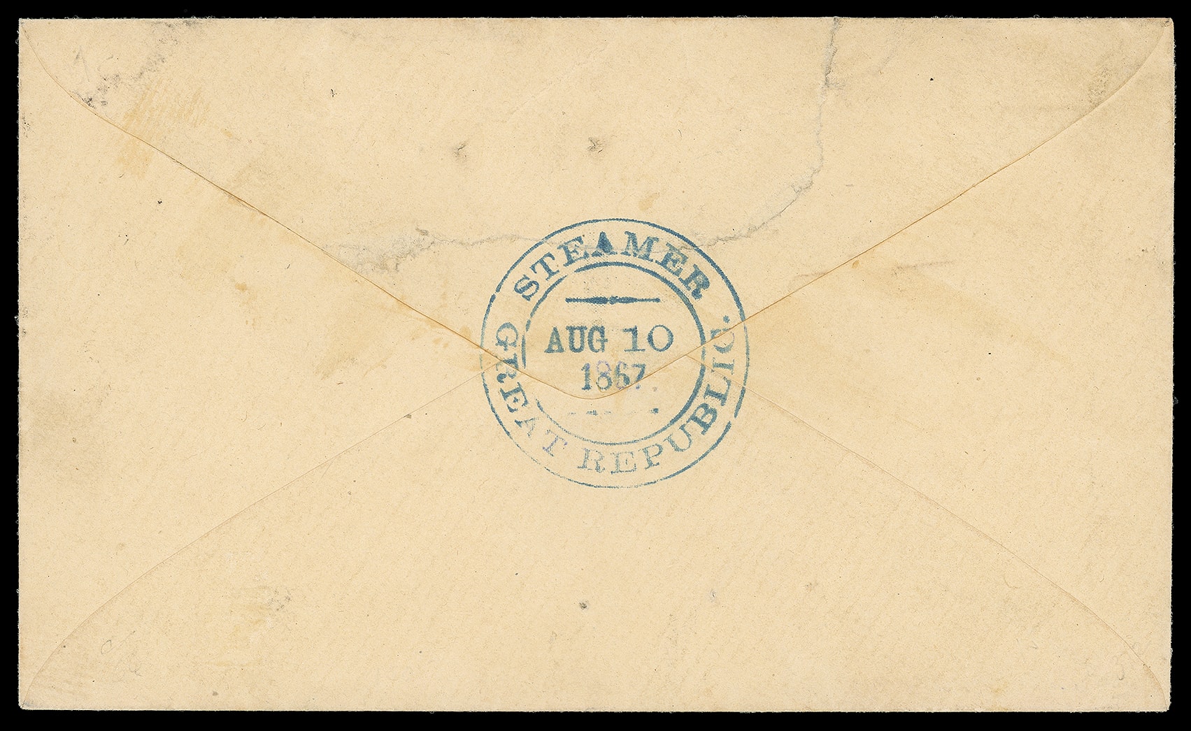 Republic (Mississippi River). Blue Aug. 10, 1867 datestamp on reverse of 3¢ pink (U59) buff entire from Hoy & Co. correspondence to New Orleans La.; opening tear affects marking which extends onto front, Very Fine