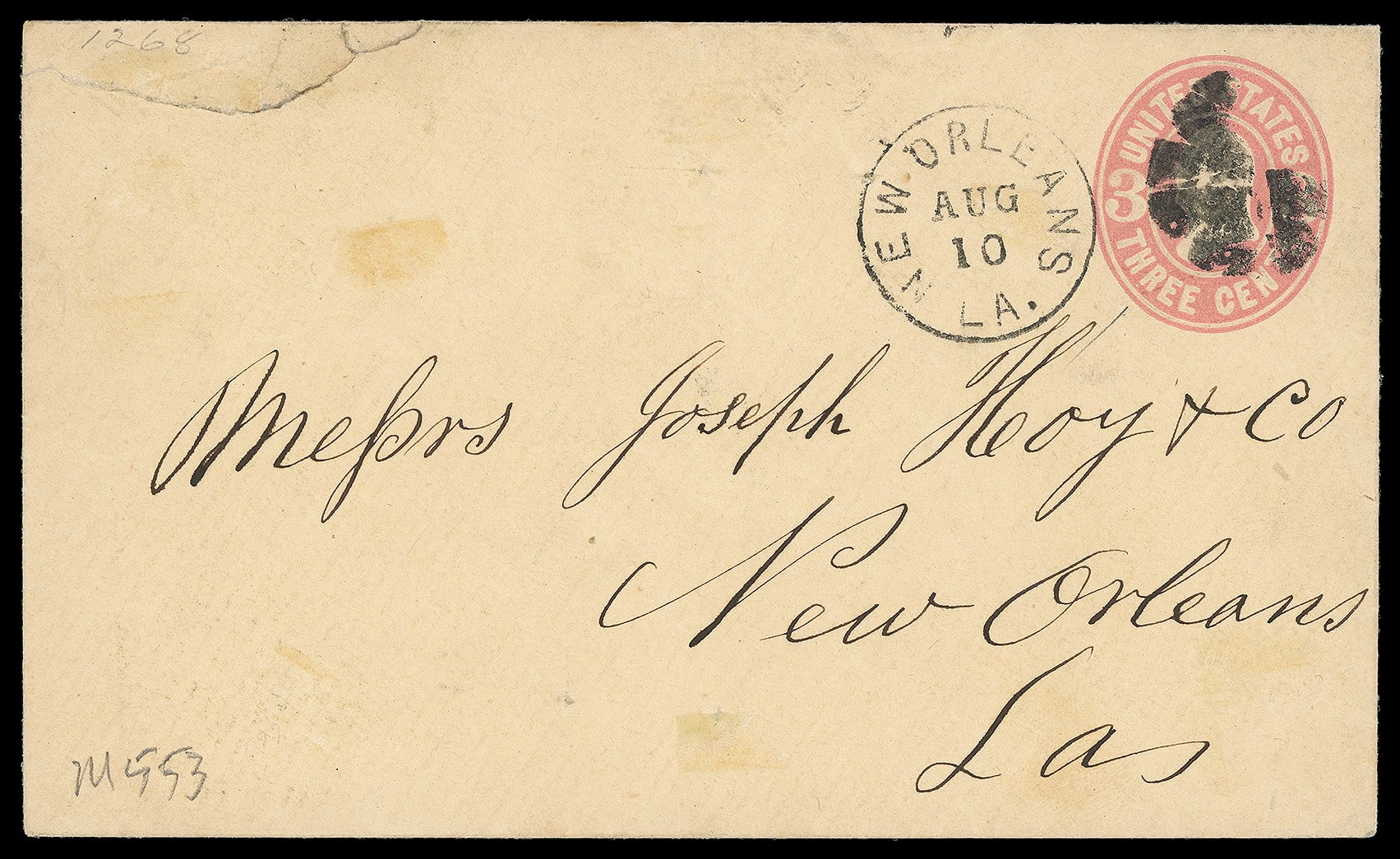 River). Perfect strike of two-line handstamp on 3¢ pink (U58) entire from the Hoy & Co. correspondence to New Orleans La.; usual filing holes, light cover bends, Very Fine and choice, ex-Somdal, Milgram. Milgram No. 546;