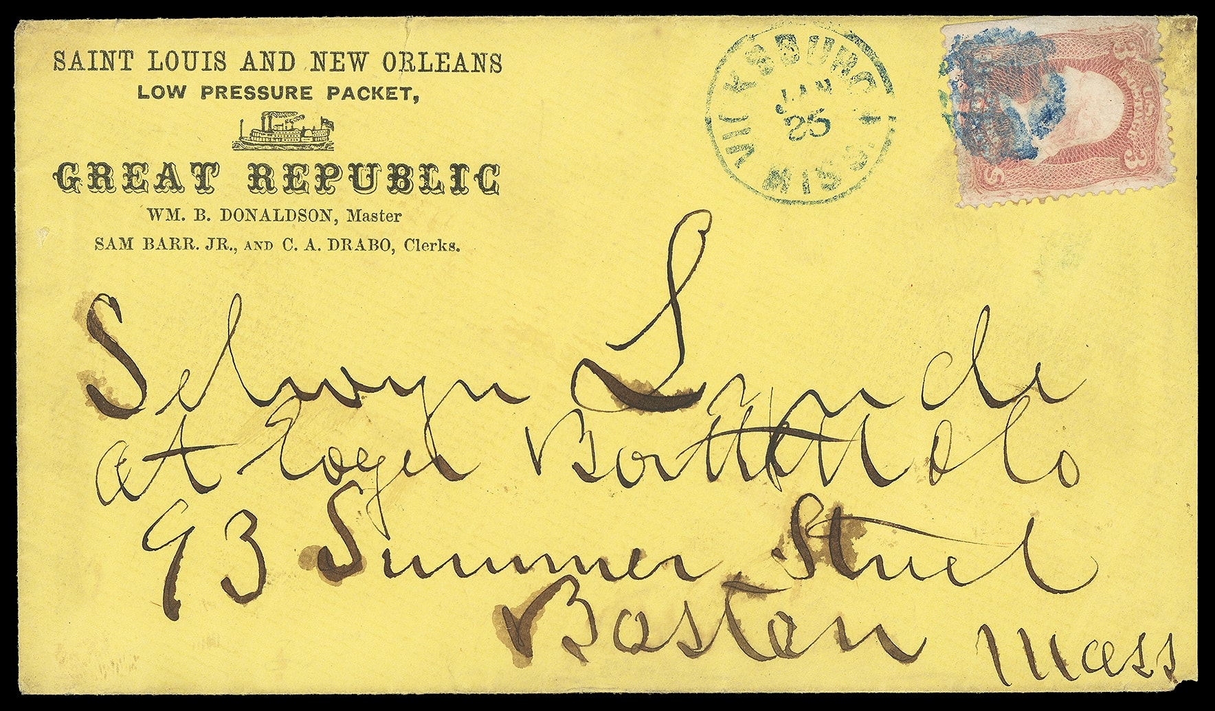 Orleans Low Pressure Packet Great Republic (Mississippi River). Illustrated corner card on lemon cover bearing 3¢ Rose (65), faults, tied by blue cork duplexed with "Vicksburg, Miss. Jan 25" cds to Boston, Mass., 1868 docketing on reverse;