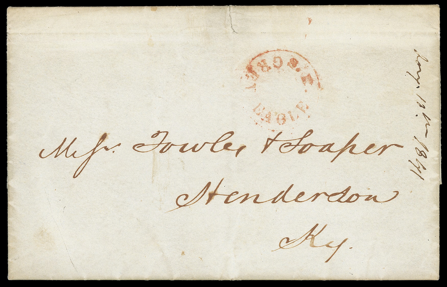 Red circular handstamp on gray 1841 folded from New Orleans La. to Henderson Ky.; small edge tear at top and horizontal bend; also includes printed receipt for cabin aboard the Grey Eagle from New Orleans to Louisville, Fine and rare early