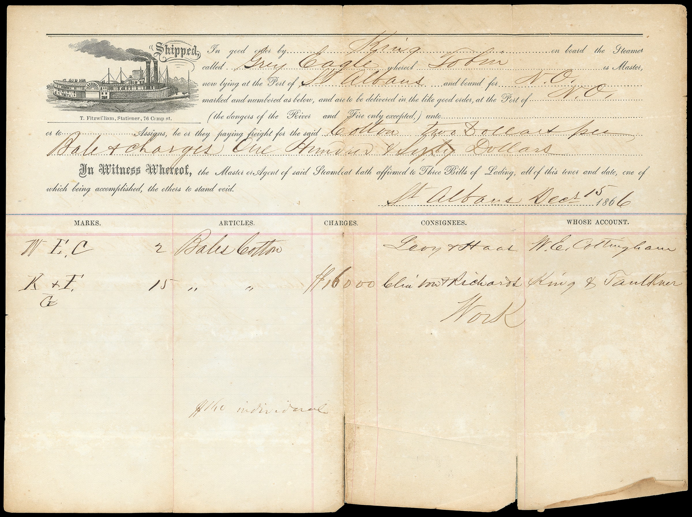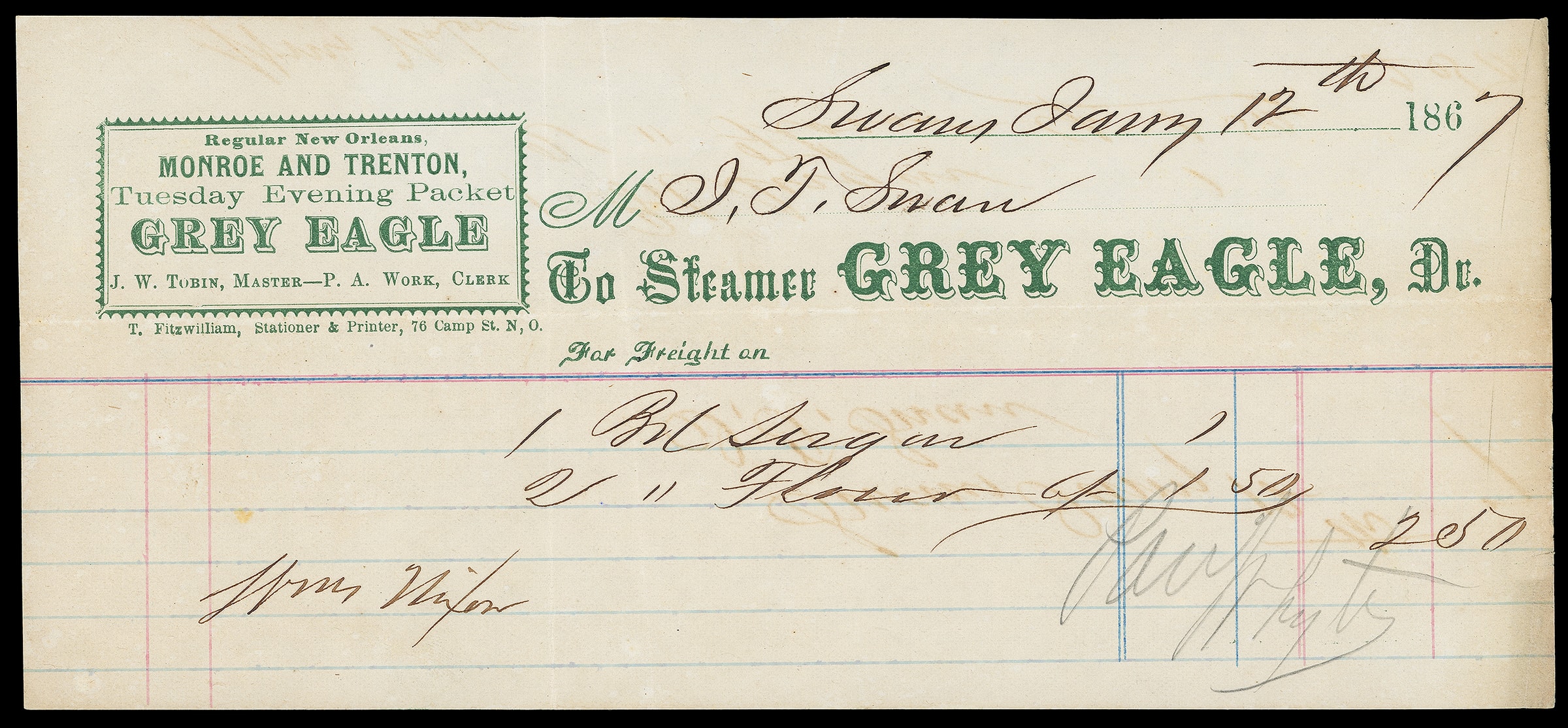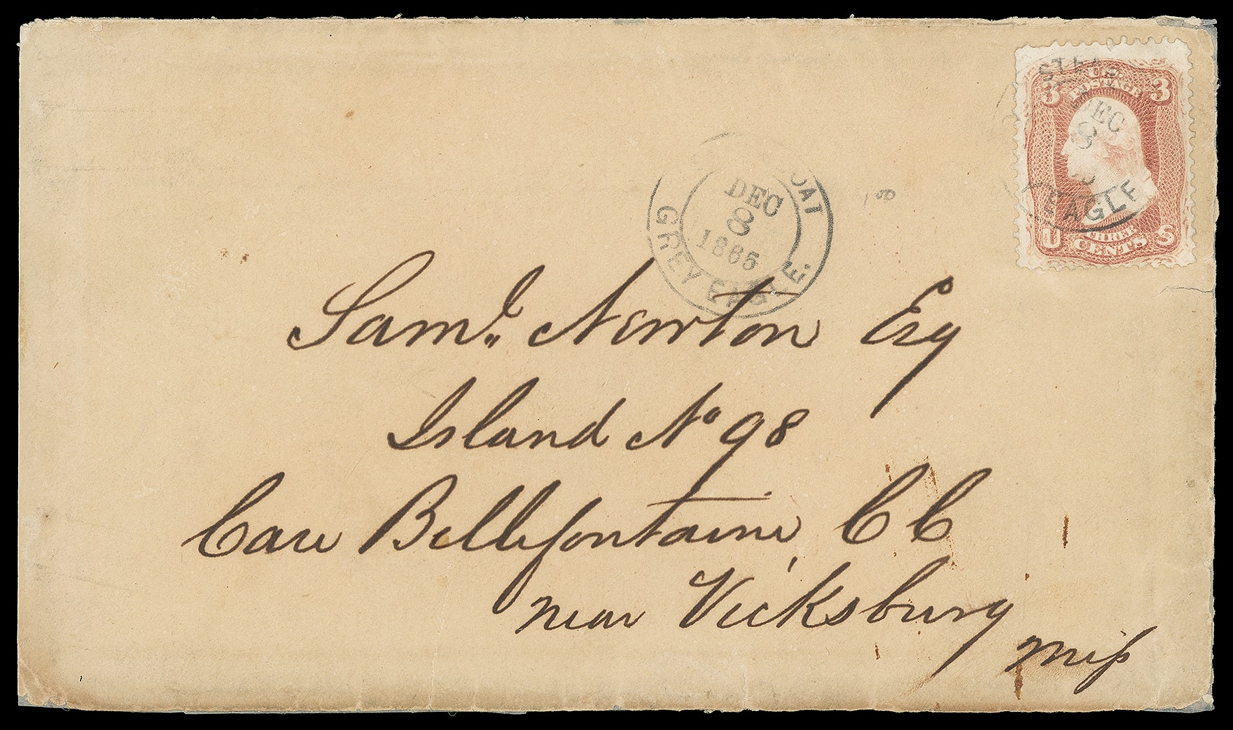 Eagle (Mississippi River). Double-circle "Dec 8 1865" datestamp ties 3¢ rose (65), minor perf flaws, on cover to "Island No.98 near Vicksburg, Miss."; neat tear into address, edge wear; also included is 1867 printed freight bill head,