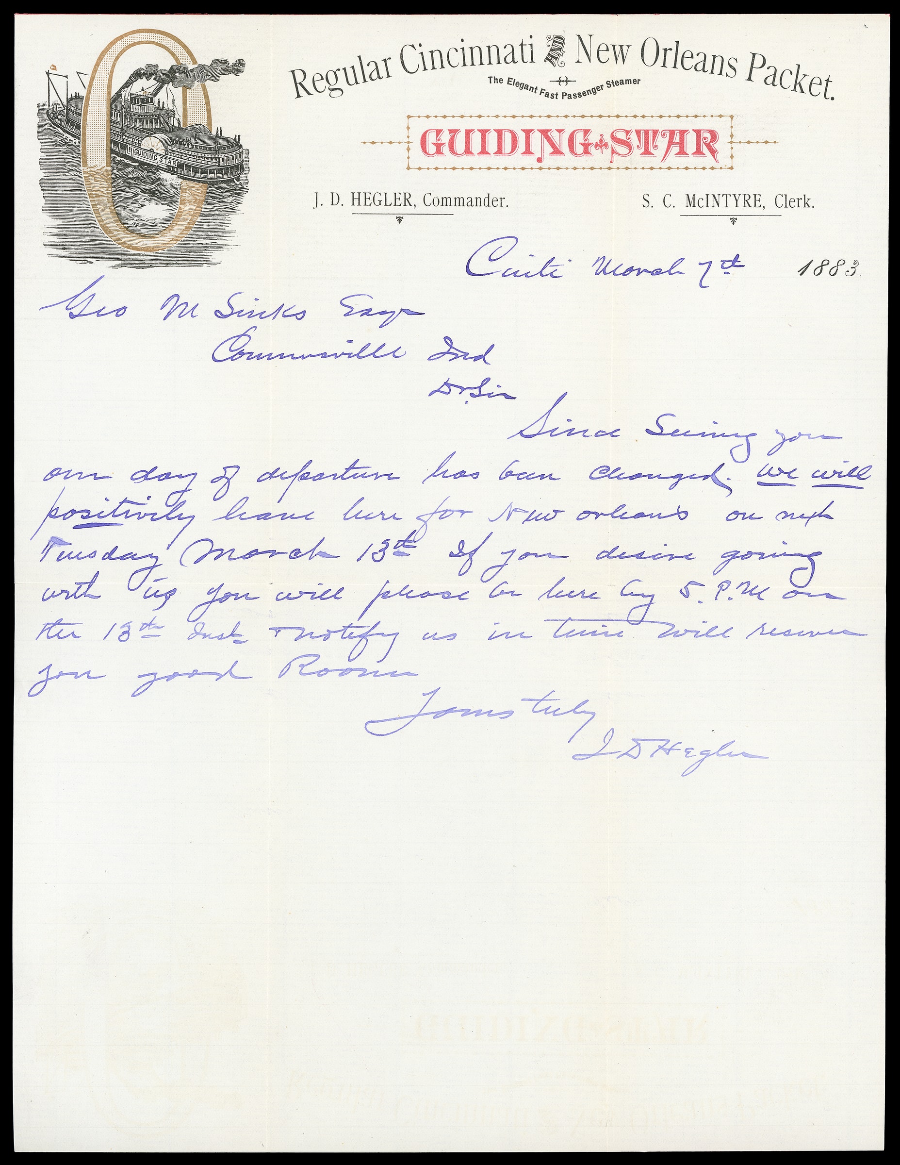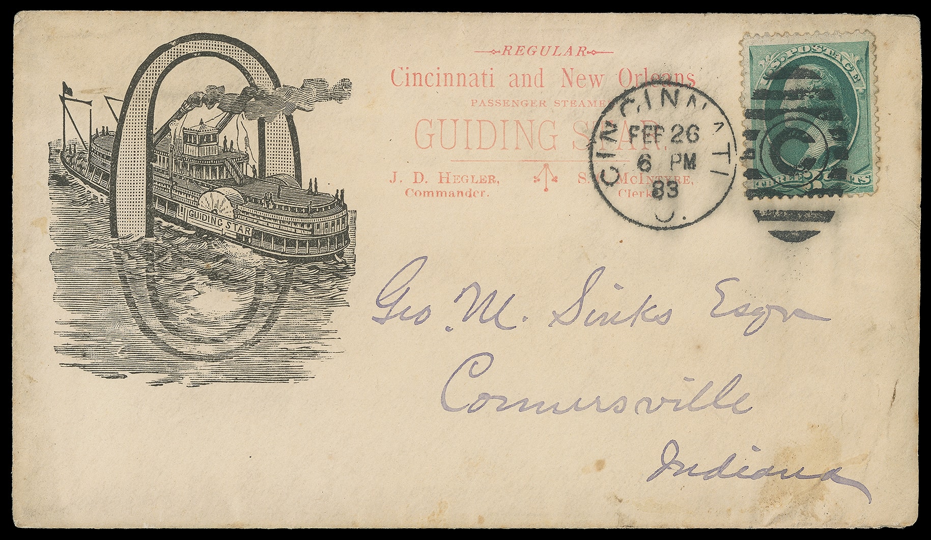 and New Orleans, Passenger Steamer Guiding Light. Red and black illustrated corner card on 1883 cover bearing 3¢ green (207) tied by "Cincinnati O. Feb 26, 83" duplex to Connersville, Ind., included is original matching letterhead in black,