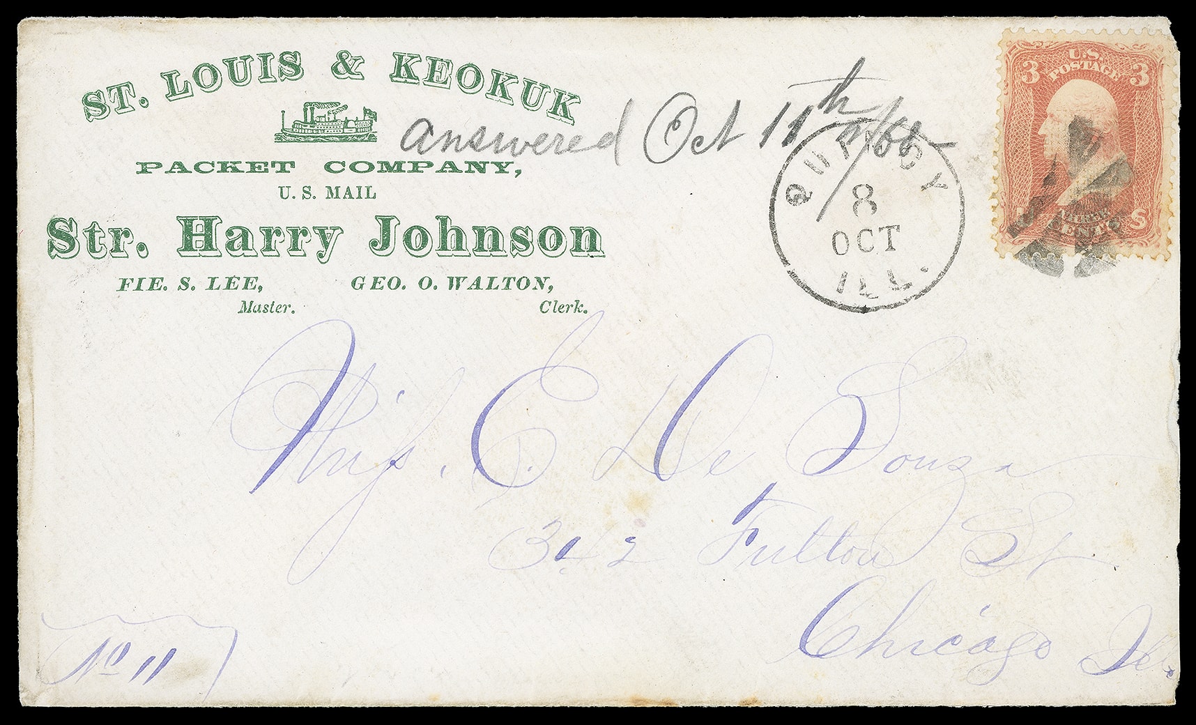 Packet Company, U.S. Mail Str. Harry Johnson (Upper Mississippi River). Illustrated green corner card on 1868 cover bearing 3¢ rose red, grilled (94) tied by segmented grid duplexed with "Quincy, Ill. 8 Oct" cds to Chicago, Ill., pencil