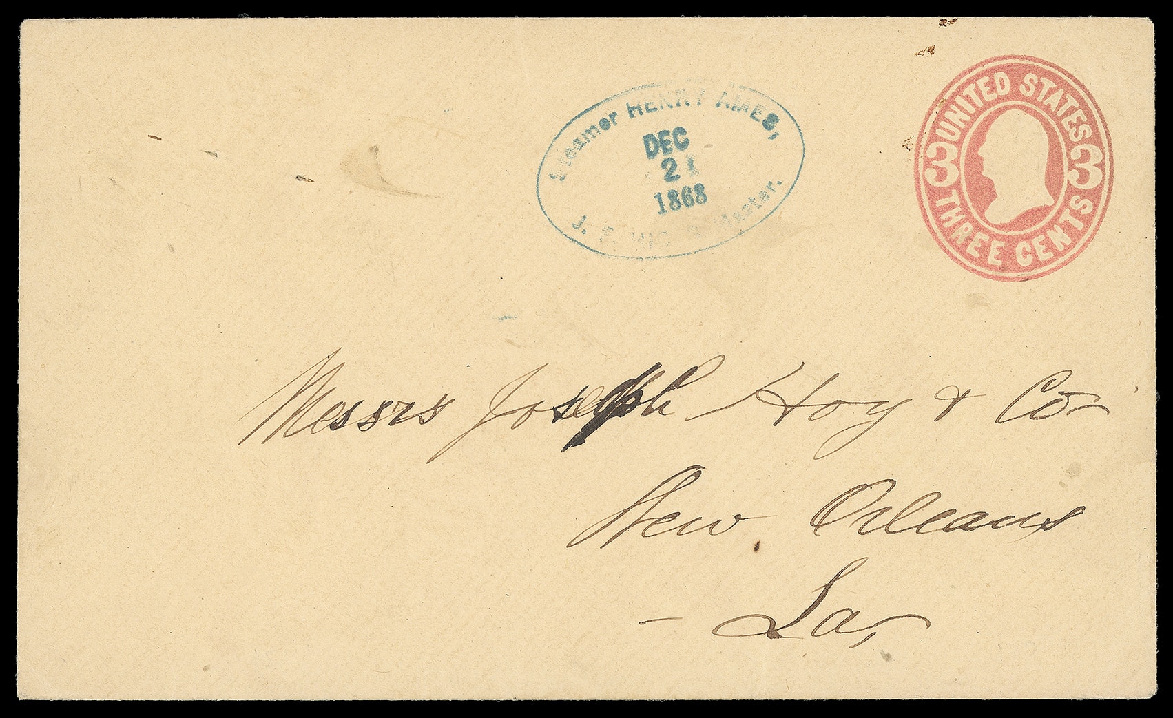 (Mississippi River). Blue oval "Dec 21, 1868" datestamp on 3¢ pink (U59) buff entire from the Hoy & co. correspondence to New Orleans La.; typical filing holes, Very Fine rare example of this packet marking,