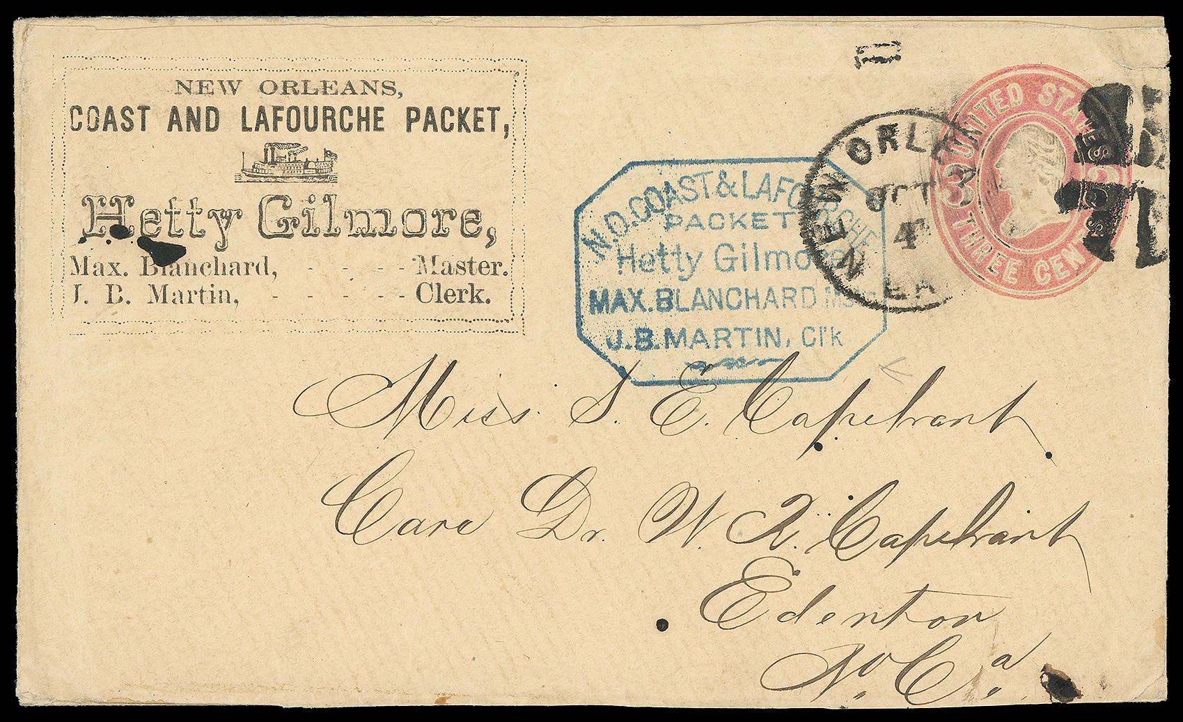 and Lafourche Packet, Hetty Gilmore (Mississippi River). Complete blue octagonal steamship handstamp on 3¢ pink (U59) rebacked front with unlisted ornate illustrated boxed corner card of the Hetty Gilmore canceled "New Orleans, La. Oct 4"