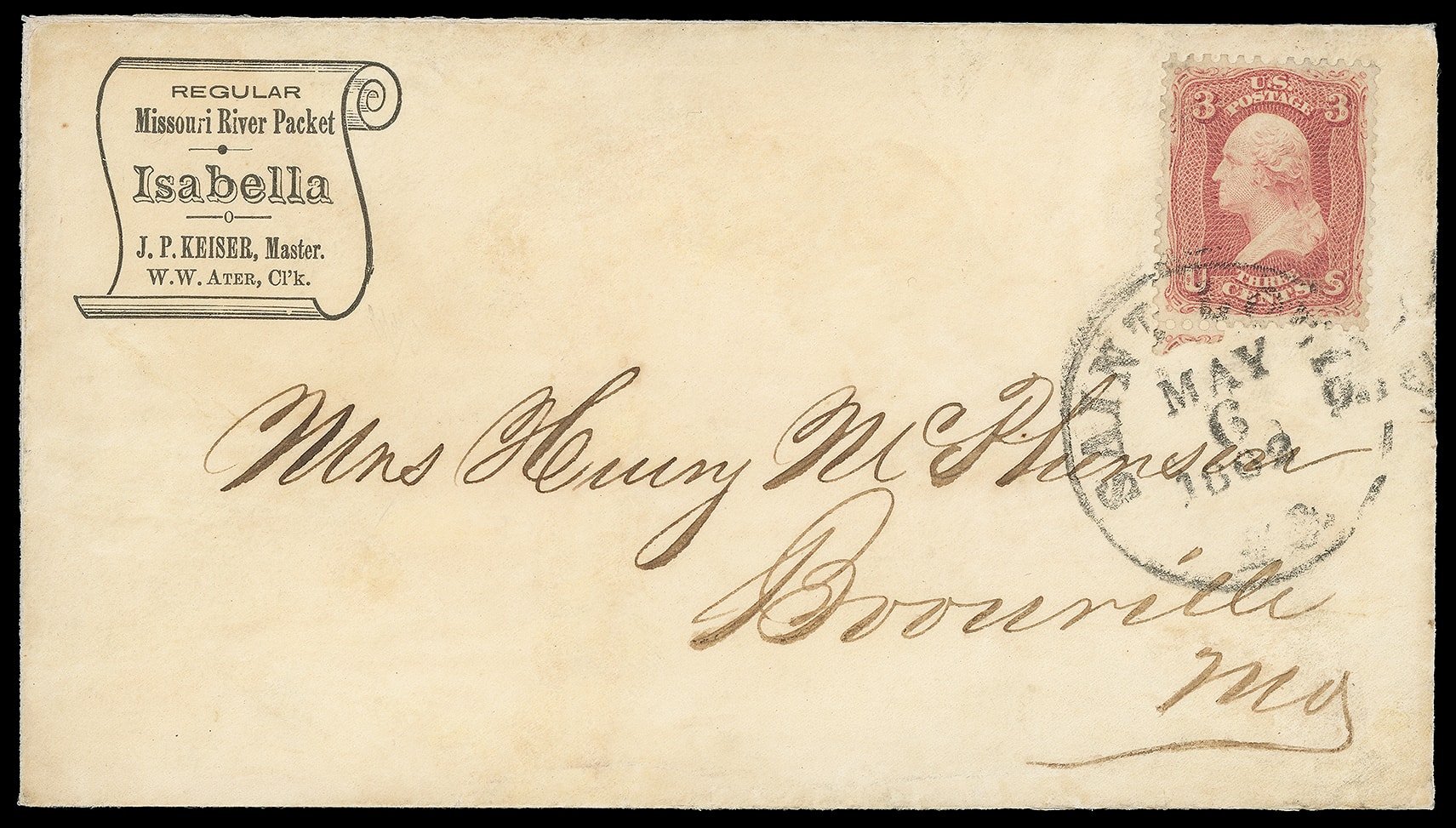 River Packet Isabella (Missouri River). Printed ornate corner card on cover bearing 3¢ rose (65) tied by "St. Louis, Mo. May 6, 1862" cds to Boonville, Mo.; cover repaired, flap reattached, Very Fine appearance, the only recorded