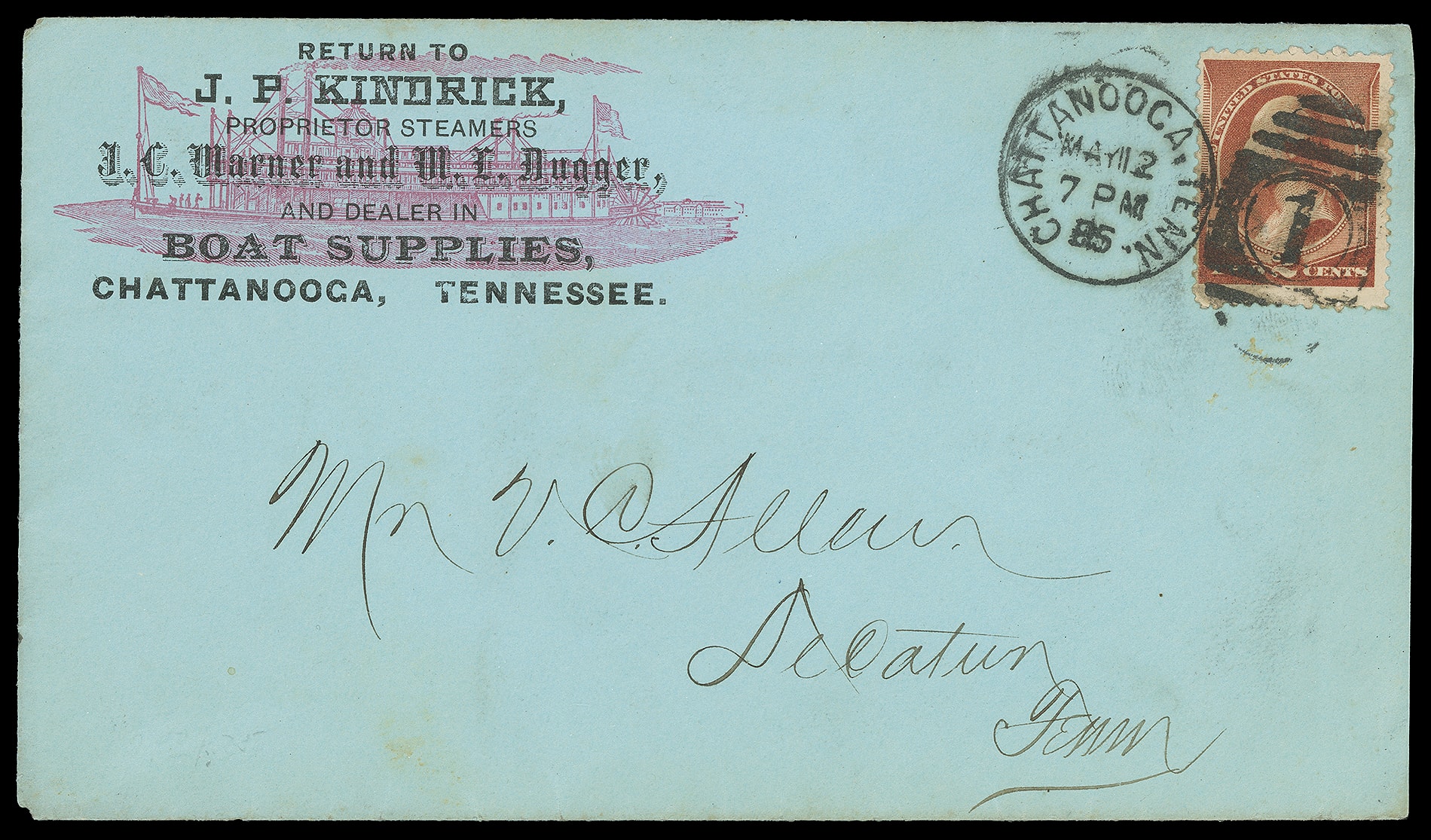 Warner and W.L. Dugger (Tennessee River). Bicolor illustrated J.P. Kindrick Proprietor advertising corner card showing steamboat on 1885 blue cover bearing 2¢ red brown (210) tied by "Chattanooga, Tenn. May 2 '85" duplex to Decatur, Tenn.,