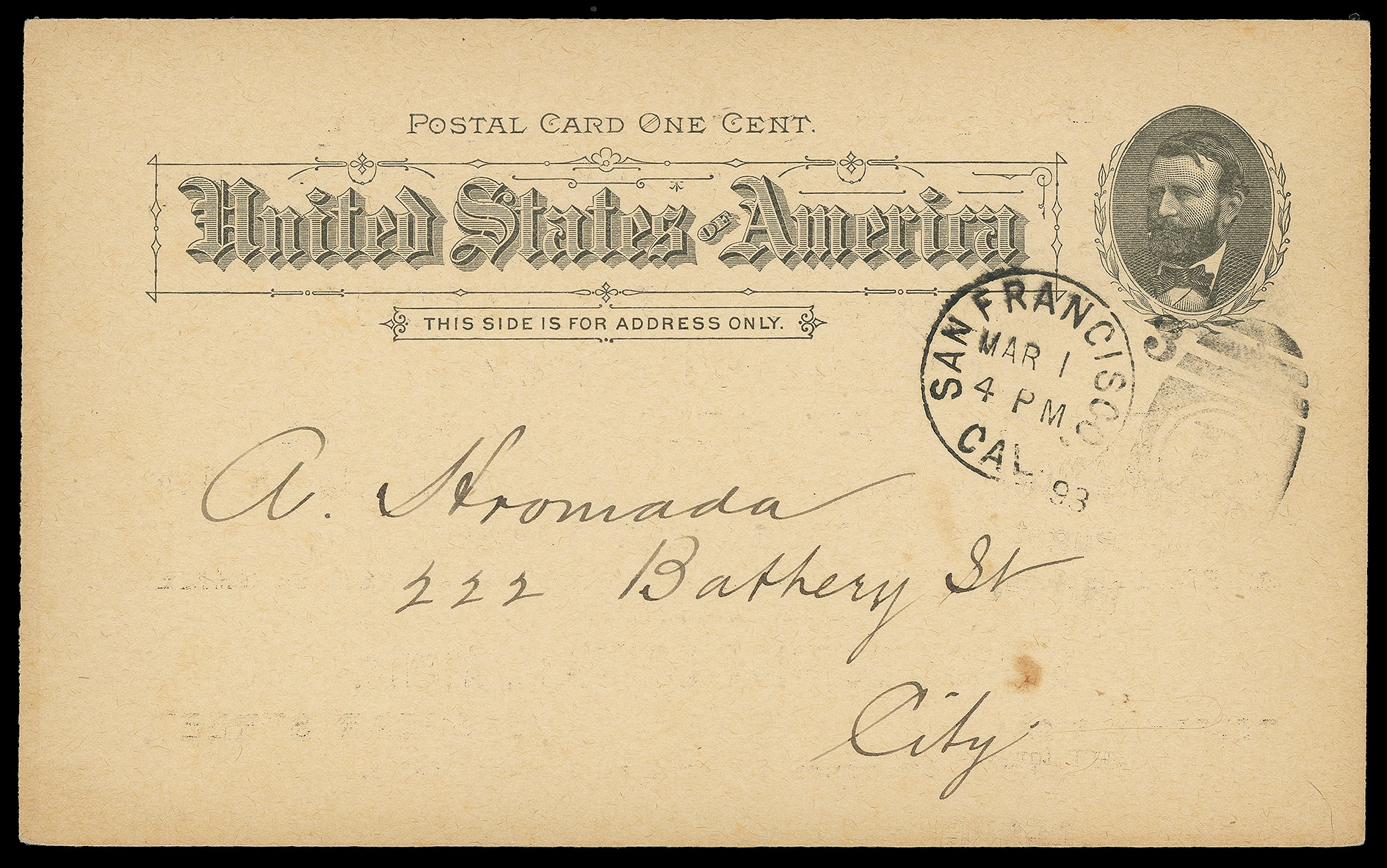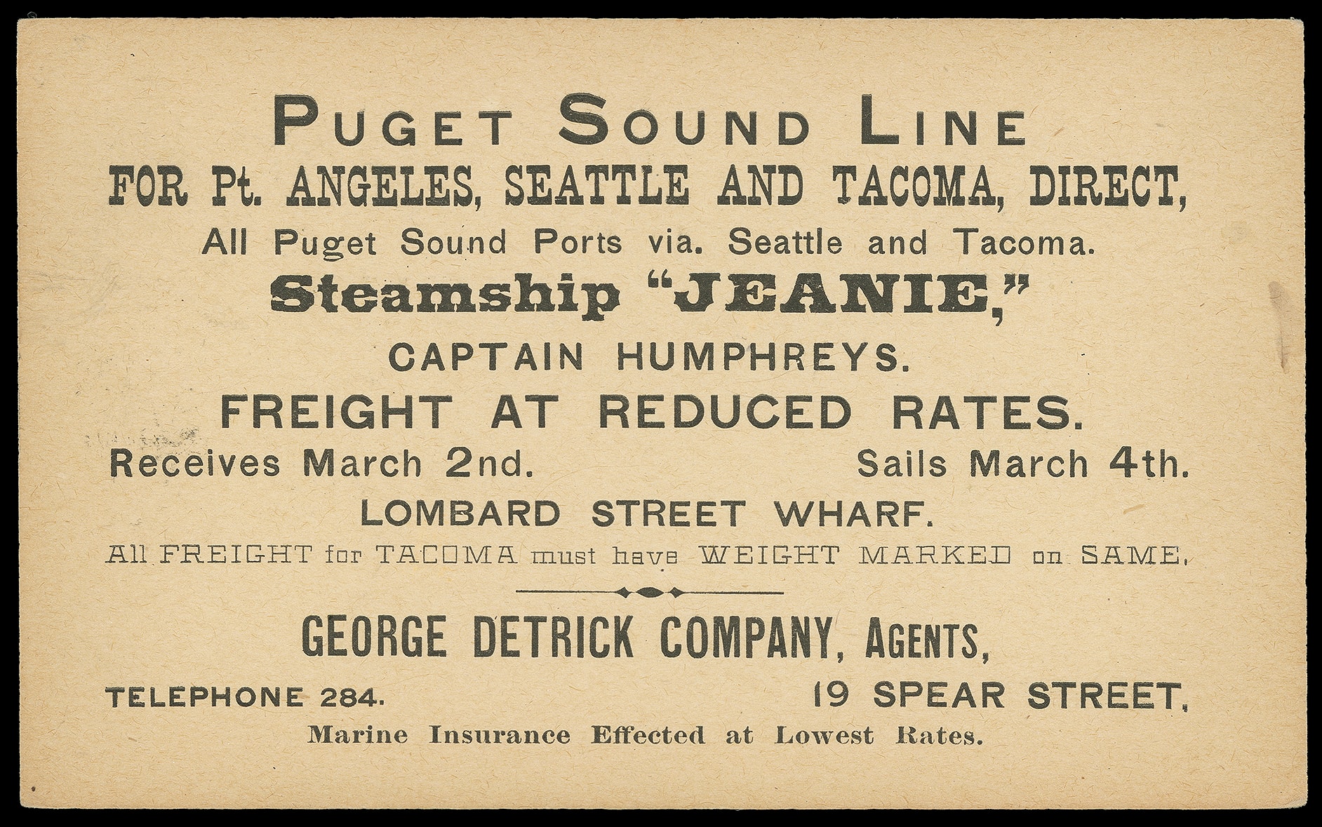 For Pt. Angels, Seattle and Tacoma Direct Steamer Jennie. Printed advertising on reverse of 1¢ postal card (UX10) canceled by "San Francisco, Cal. Mar 1 '93" duplex to local street address, Very Fine, unlisted in Milgram. Milgram