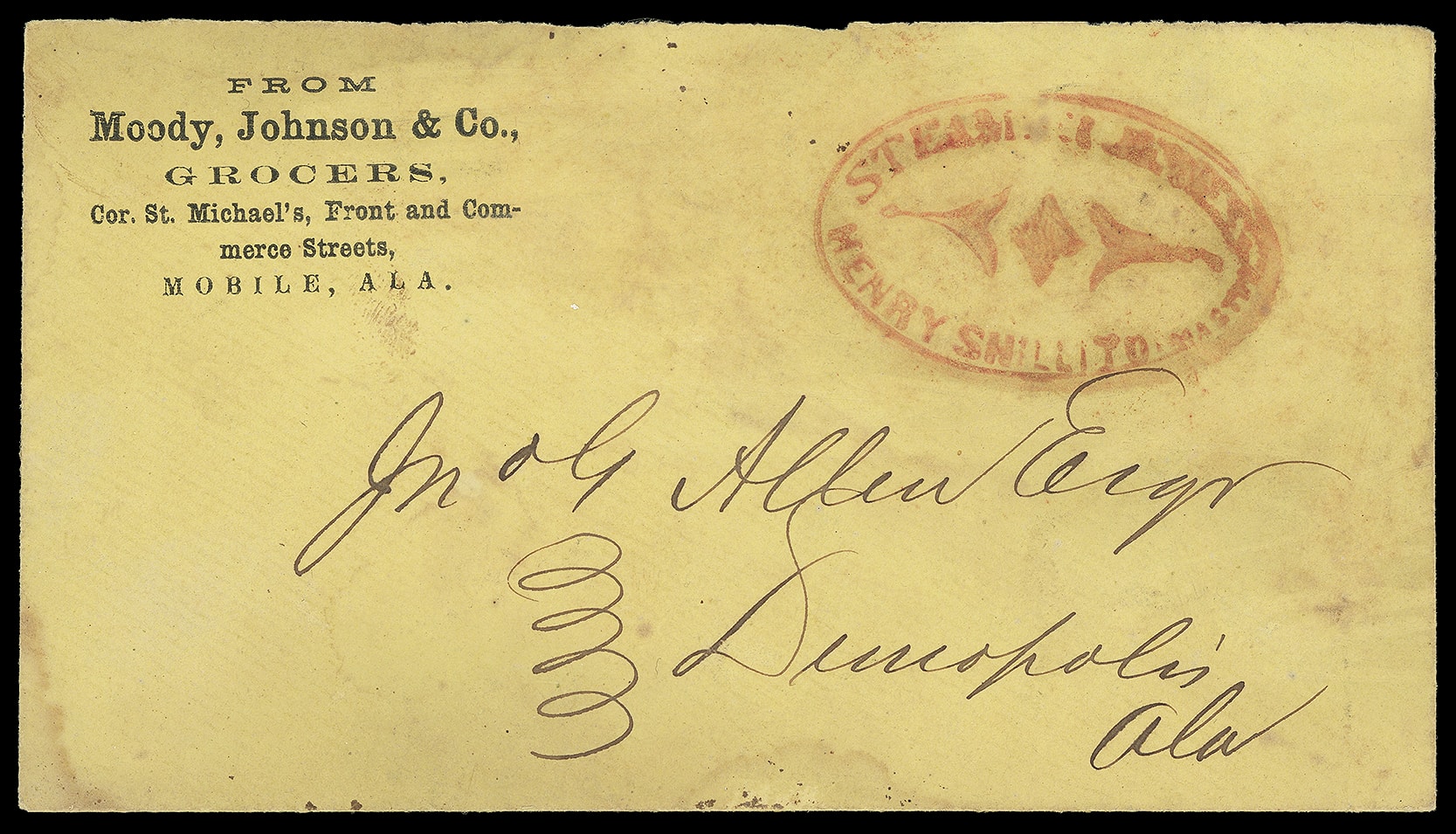 (Alabama River). Red oval handstamp on yellow cover with Moody, Johnson & Co. Grocers, Mobile Ala. corner card to Demopolis, Ala.; light stains, flap missing and bit of reverse missing, also included is 1868 print and illustrated freight bill in