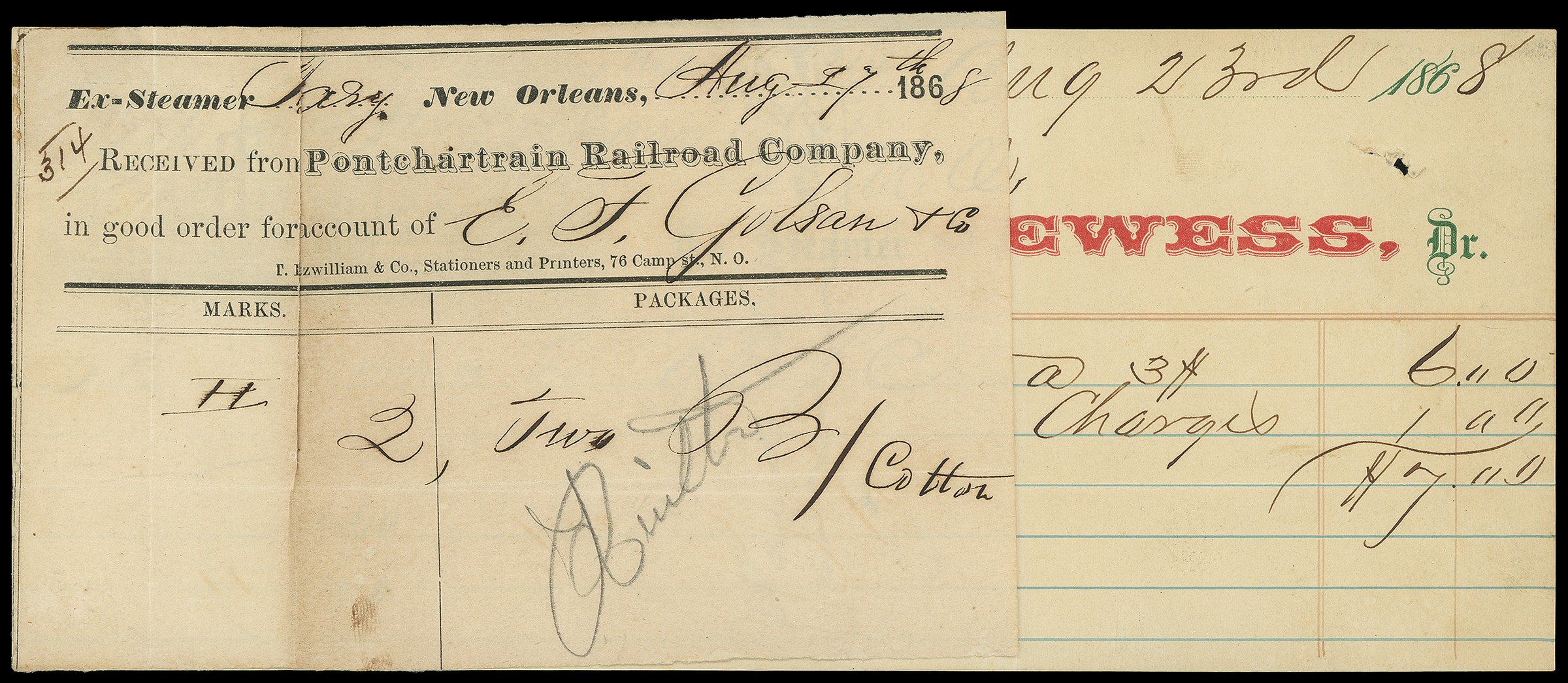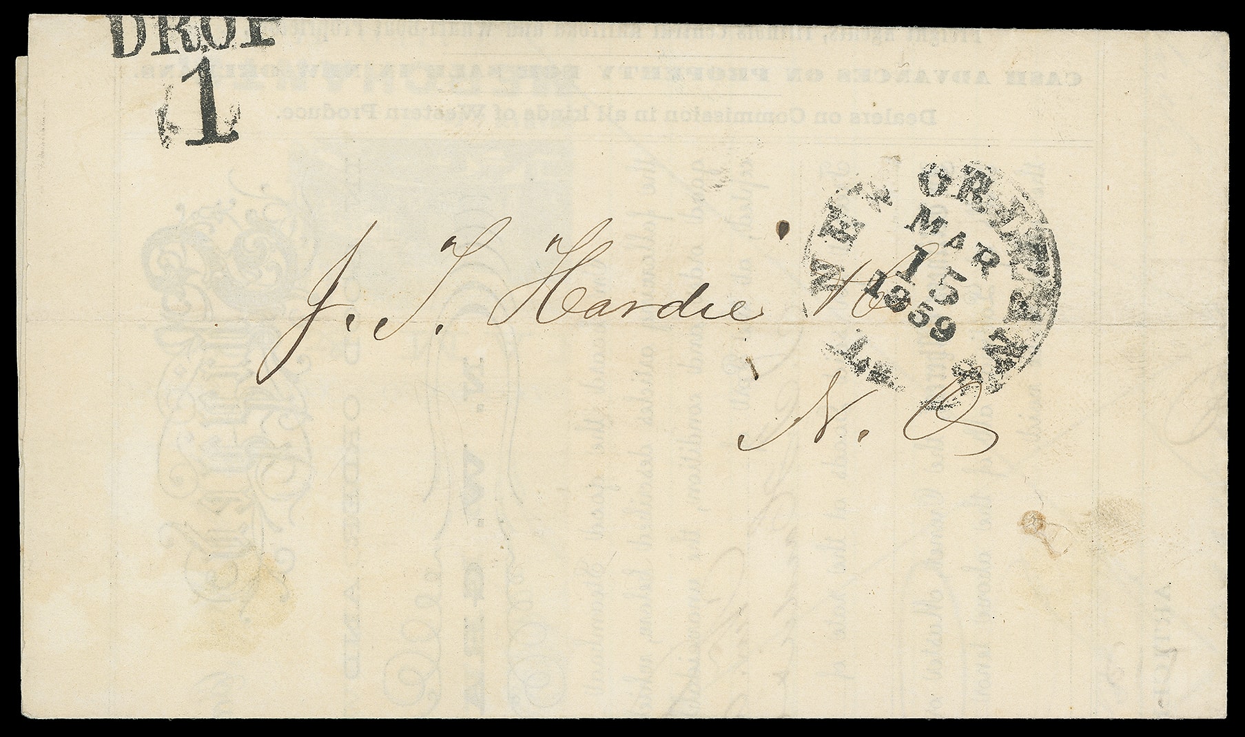 Orleans La., Mar 15, 1859" cds and "DROP 1" rating handstamp to Hardee & Co., also included is 1860 printed freight bill in blue, Very Fine and rare, the only recorded example. Milgram No. 721; Estimate $300 - 400. (Image1) (Image2)