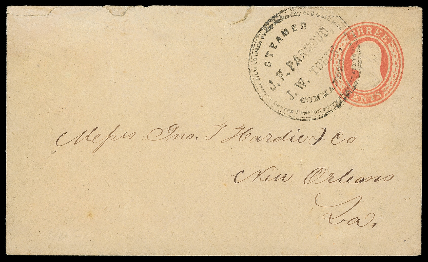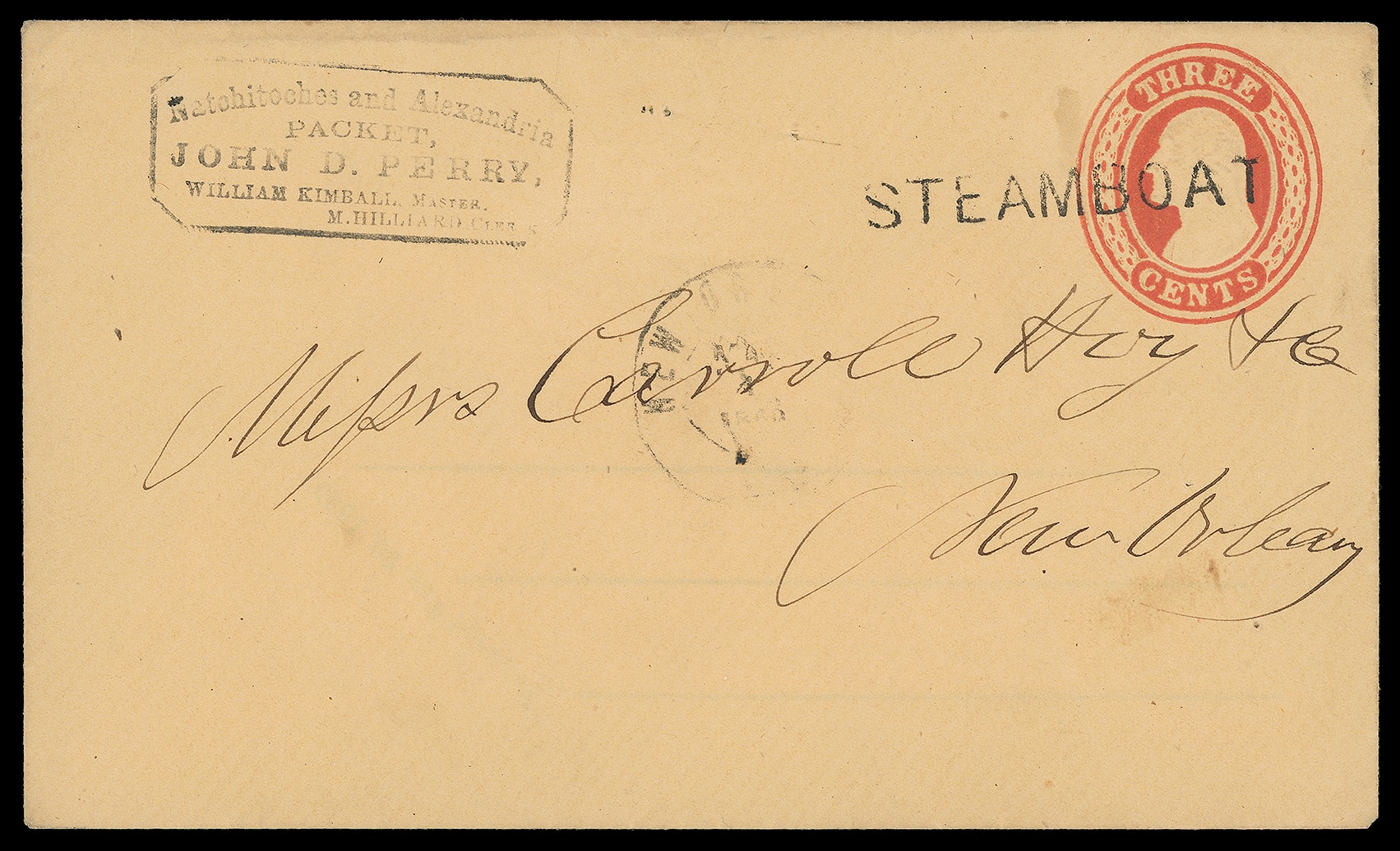 Alexandria Packet John D. Perry (Red River). Neat octagonal boxed handstamp on 3¢ red (U10) buff Nesbitt entire from the Carroll Hoy & Co. correspondence canceled by "Steamboat" straightline, matching partial "New Orleans La." cds to New