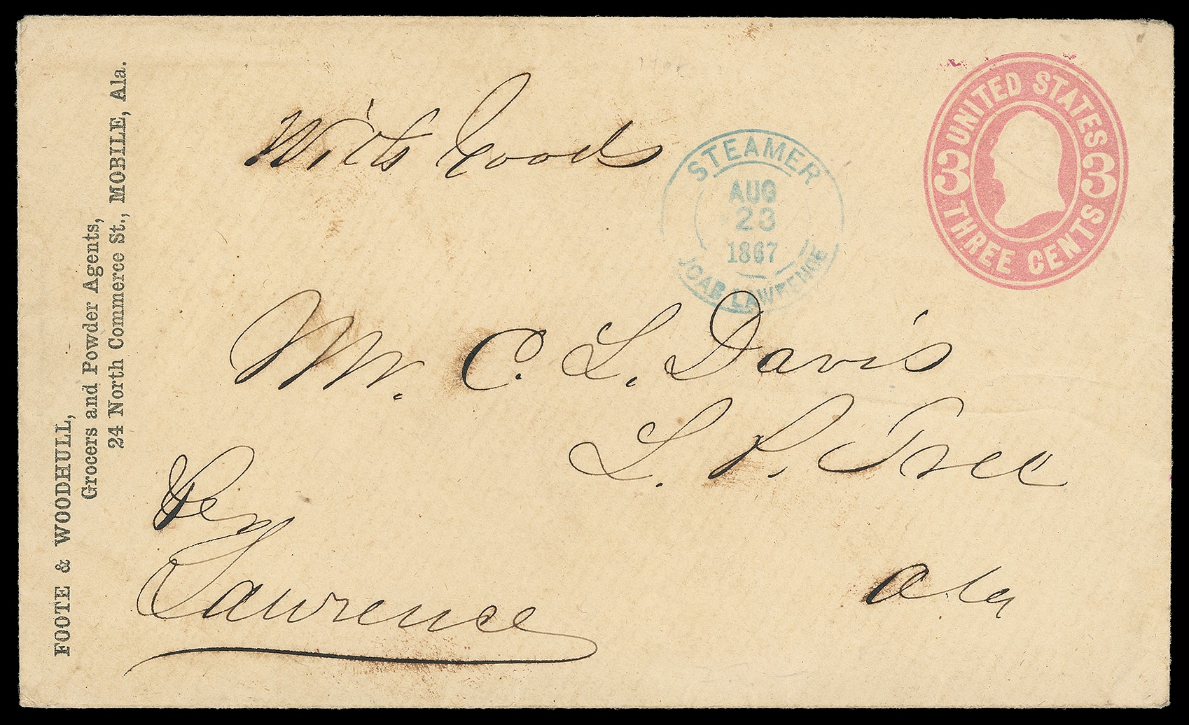 Lawrence (Alabama River). Blue "Aug 23, 1867" double-circle datestamp on 3¢ pink (U59) buff entire from Mobila Ala. to Alabama, endorsed "Per Laurence", original enclosure datelined "Mobile Aug. 23/67", Very Fine and