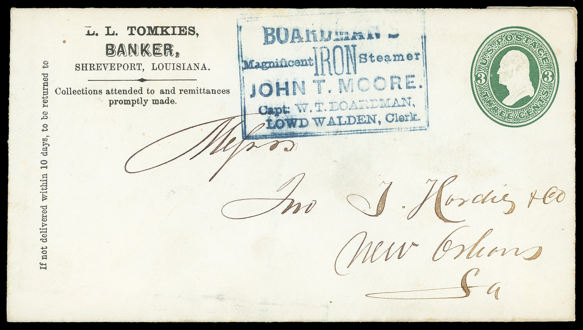 Magnificant Iron Steamer "John T. More" (Mississippi and Red Rivers). Bold blue boxed handstamp on 3¢ green (U82) entire with printed "L.L. Tomkies, Banker, Shreveport, Louisiana" corner card to New Orleans La., also included is second