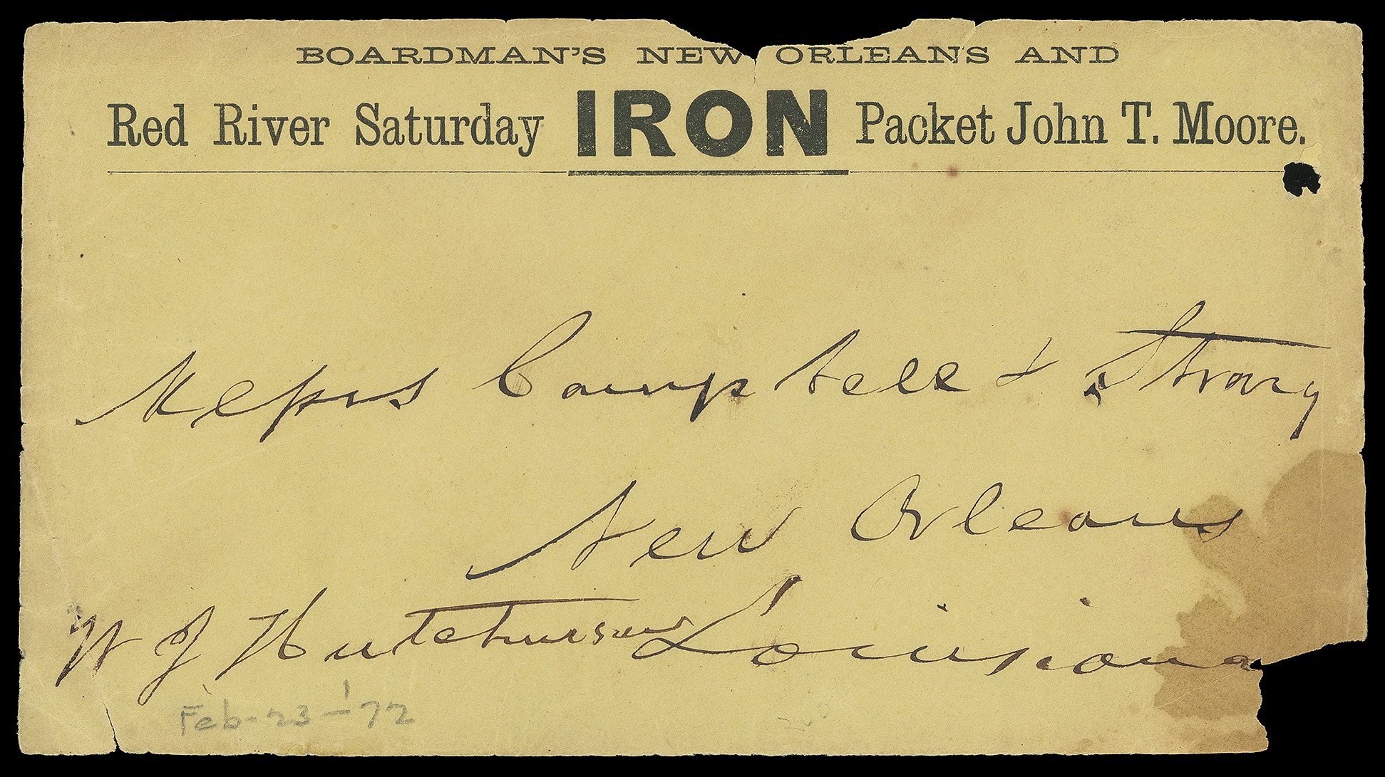 cover with printed corner card across top for the "Red River Saturday Iron Packet John T. Moore" addressed to New Orleans, cover defective & separated from reverse, first Very Fine and choice, the only recorded example. Milgram No.
