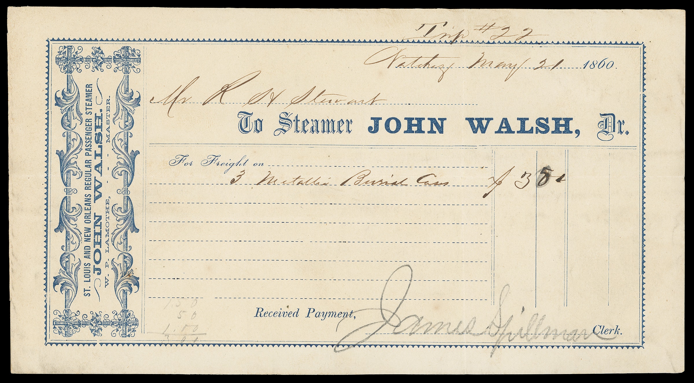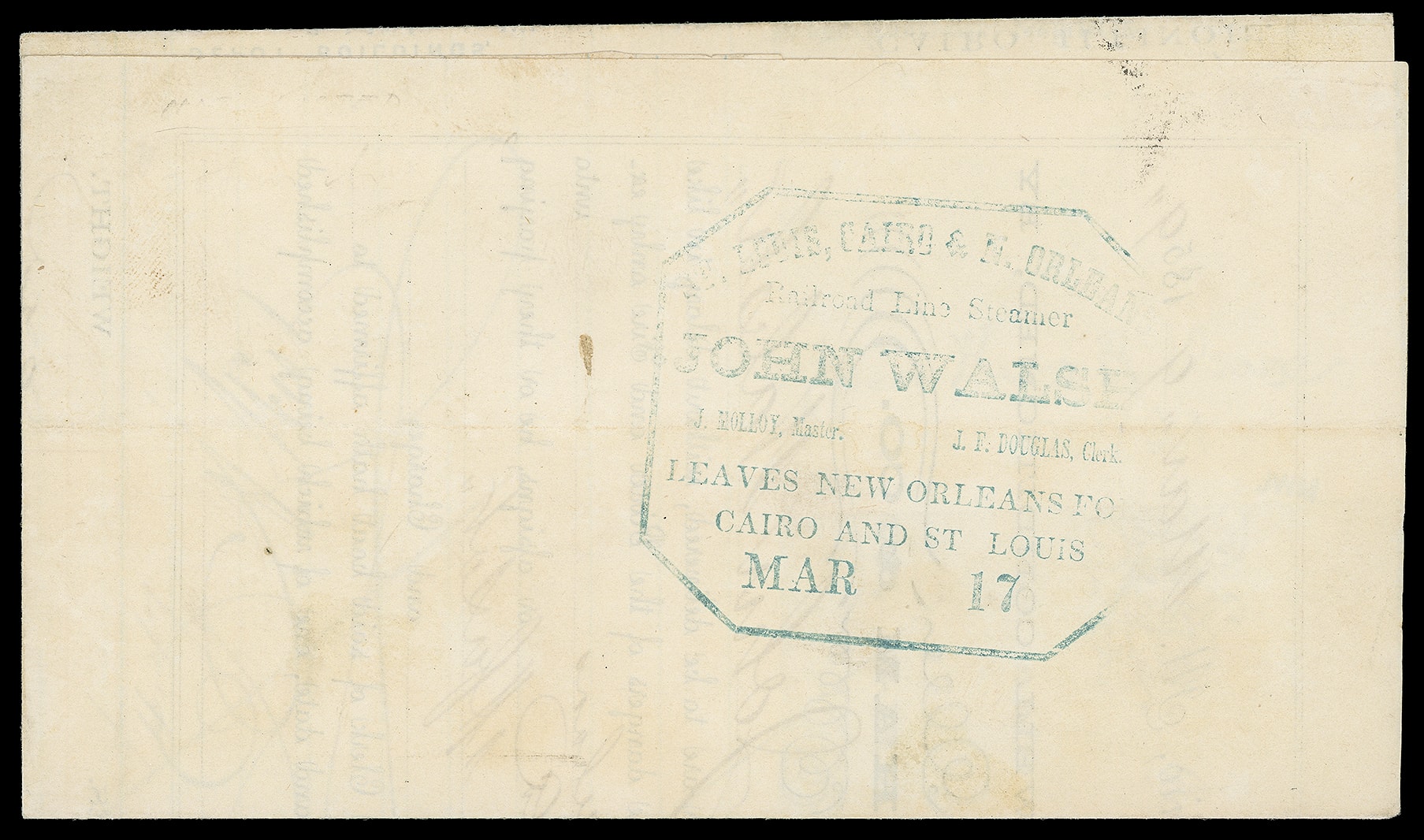 Line Steamer "John Walsh" (Mississippi River). Large blue octagonal handstamp on reverse of folded printed and illustrated 1859 Bill of Lading from Forwarding Merchants in Cairo, Ill. addressed to New Orleans La., entered mails with black "New