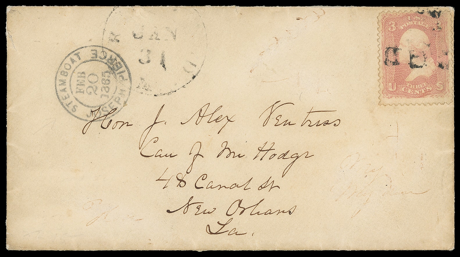 Pierce (Mississippi River). Black "Feb 20, 1865" double-circle datestamp on cover bearing 3¢ rose (65) barely tied by grid cancel, matching "Jan. 31" town cds to New Orleans La., some docketing erasures, Very Fine strike of this rare