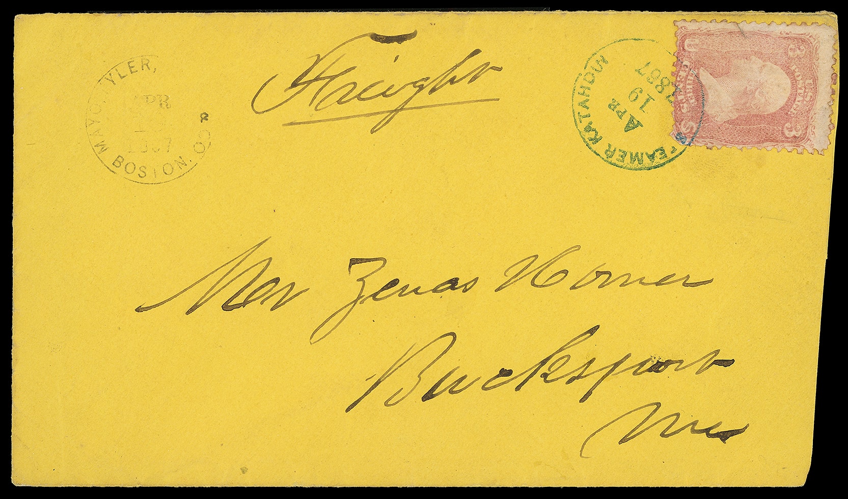(New England Coast). Blue "Apr. 19, 1867" cds ties 3¢ Rose (65), small faults, on orange cover from Boston Mass. to Bucksport, Me. partial Boston company handstamp, endorsed "Freight" at top; slightly diagonal reduction at right, Fine