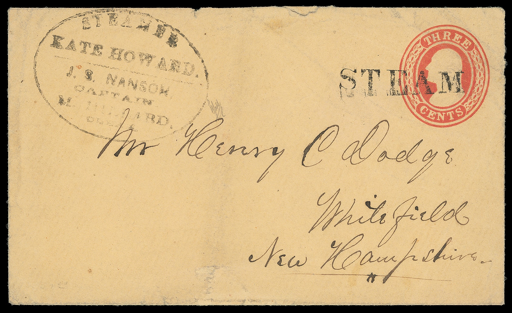 (Missouri River). Large oval handstamp on 3¢ red (U10) buff Nesbitt entire caneled by large "Steam" straightline to Whitefield N.H.; small edge flaws, partial flap, F.-V.F. and rare, ex-Somdal, Milgram. Milgram No. 744;