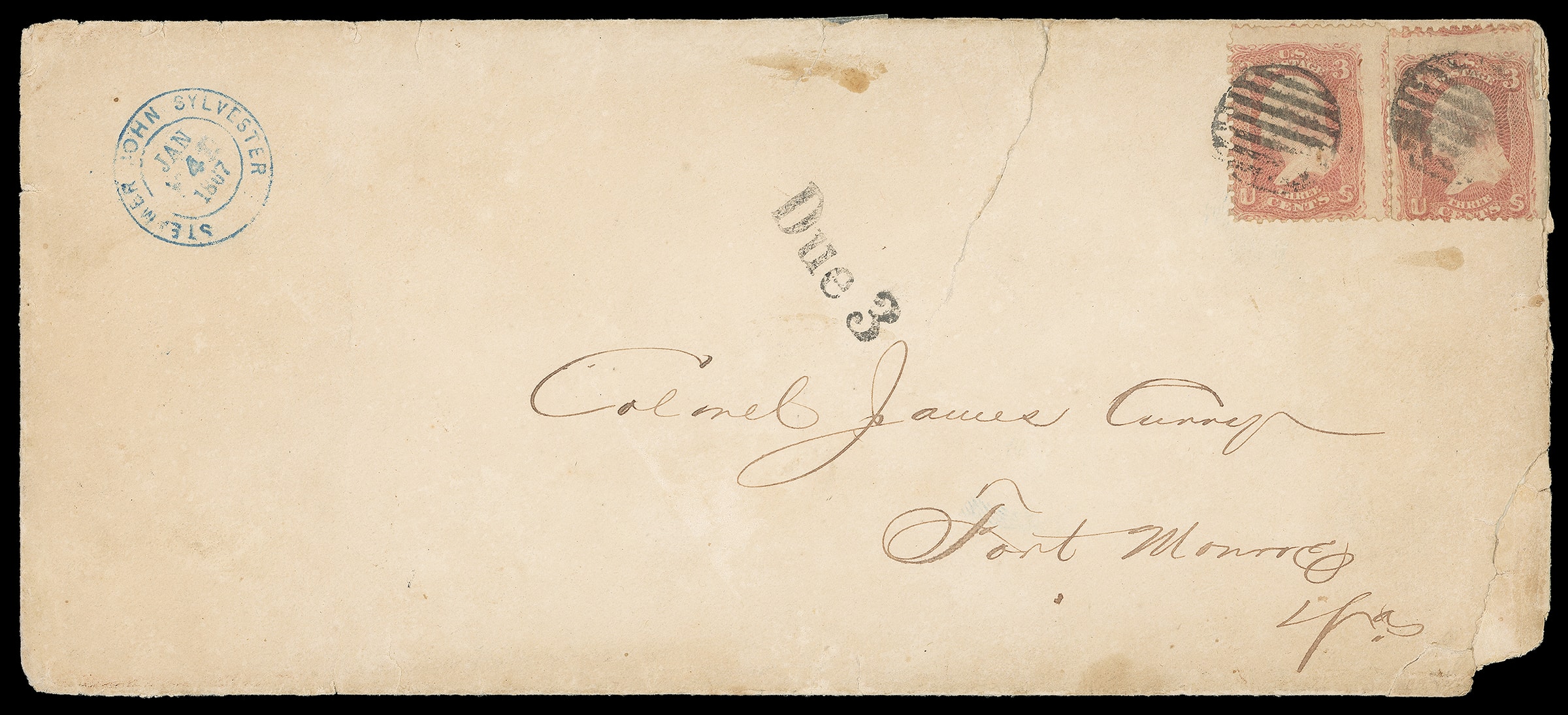 Sylvester. Blue "Jan. 4, 1867" double-circle datestamp on legal size cover bearing 3¢ rose (65), two singles, tied by circular grid cancel, matching "Due 3" handstamp to Col. James Curry, Fort Monroe, Va.; faults, Fine appearance,
