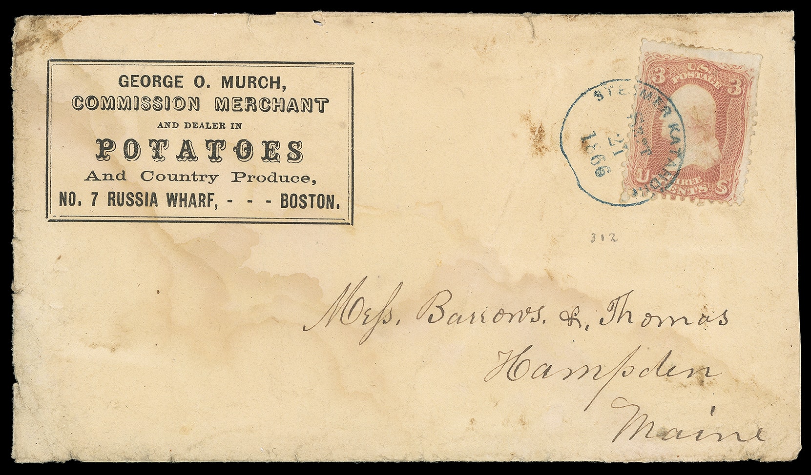 (New England Coast). Blue "Sept. 21, 1866" irregular cds ties 3¢ rose (65), some blunt perfs, on "George O. Murch, Commission Merchant, Boston Mass." framed corner card cover to Hampden, Maine; cover some wear staining, also included is