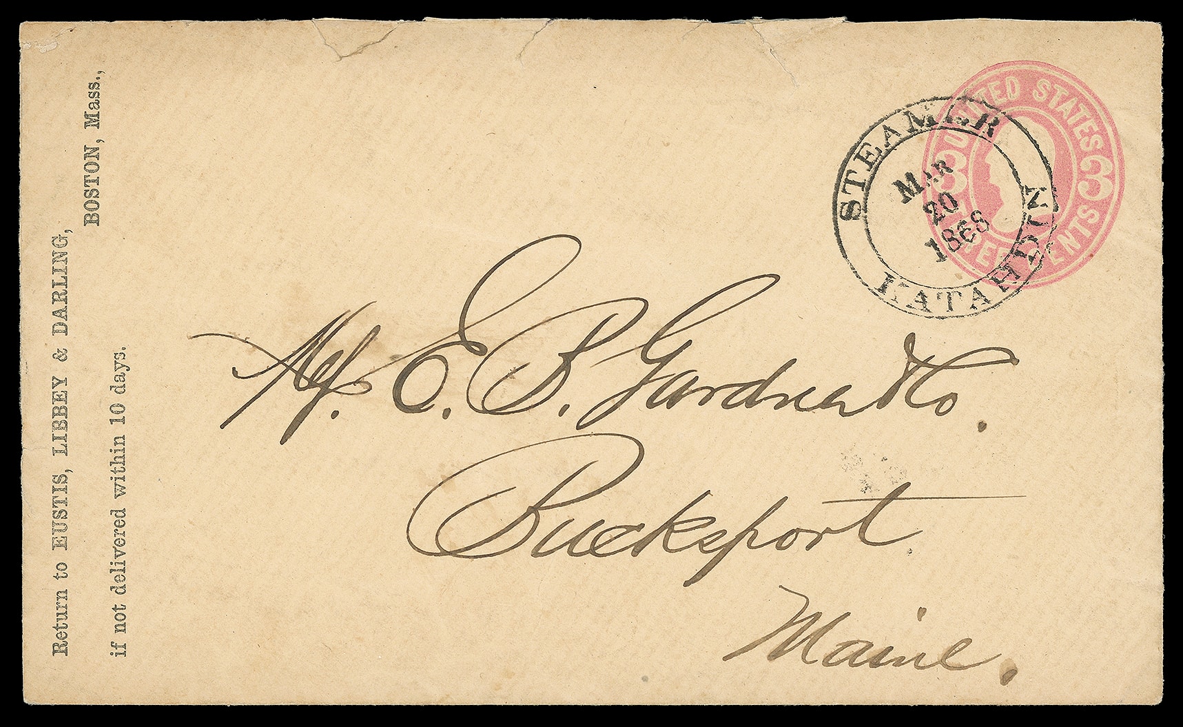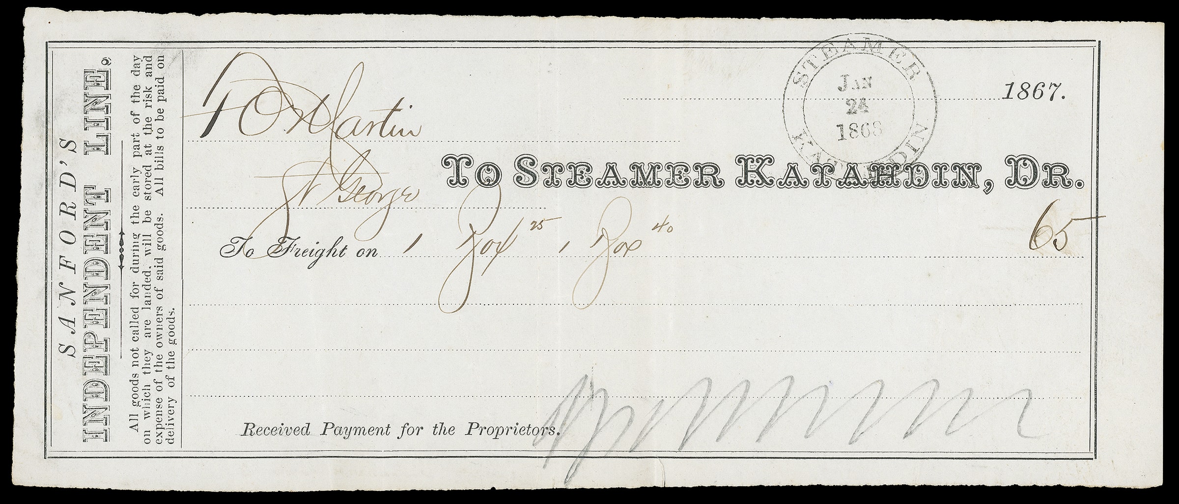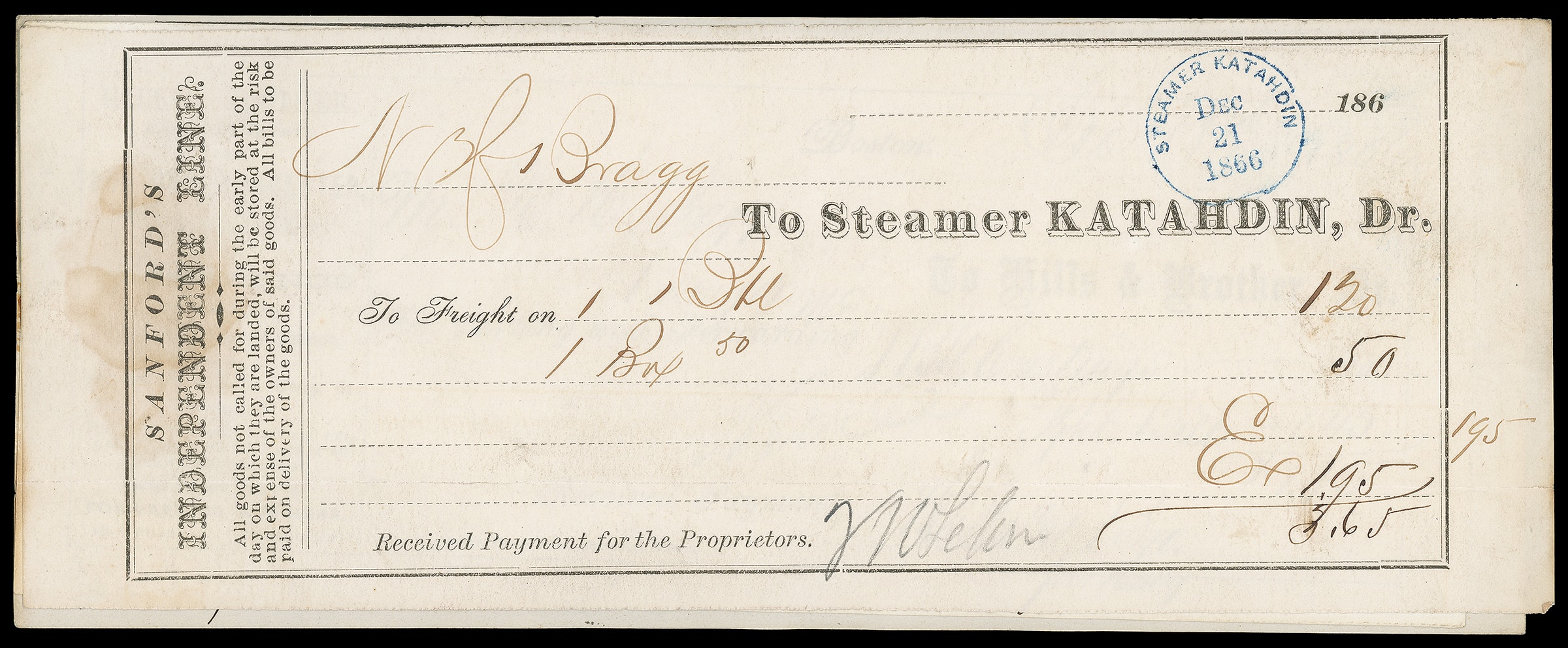 printed freight bill with similar steamboat marking dated "Dec. 21, 1866", F.-V.F., a rare example of the steamboat marking tying the adhesive. Milgram No. 741; Estimate $150 - 200. (Image1) (Image2)