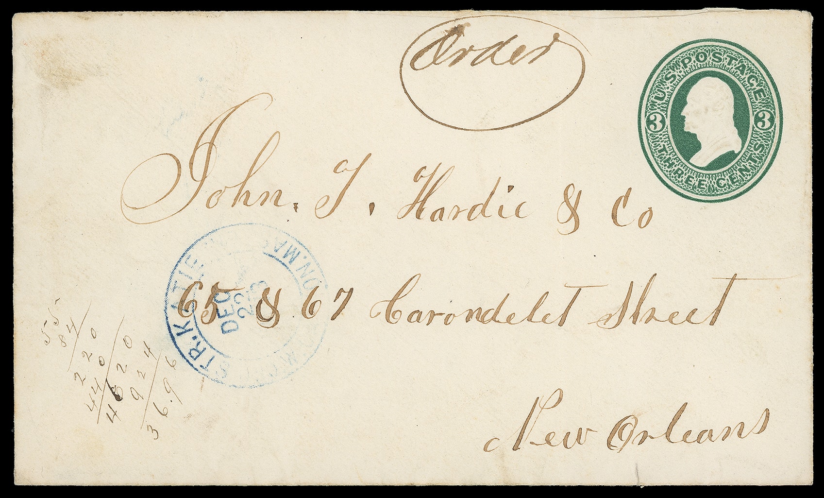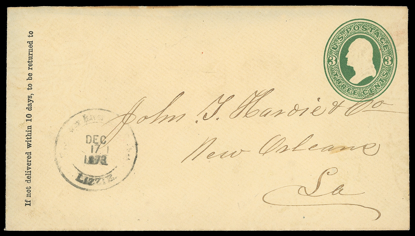 "Dec 22, 1873" double-circle datestamp on 3¢ green (U82) entire from Hardie & Co. correspondence to New Orleans La.; light vertical cover fold, also includes 1871 printed freight bill, F.-V.F. Milgram No. 748; Estimate $100 - 150. (Image1)