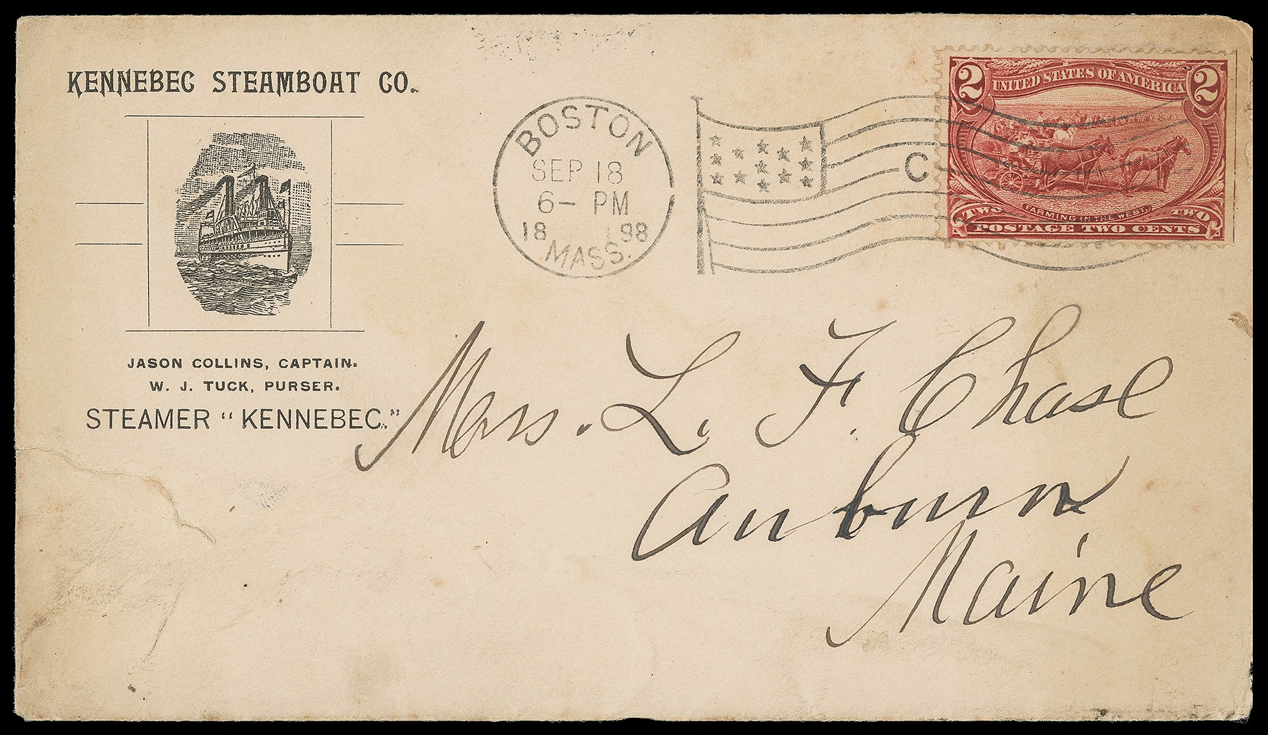 Co., Steamer Kennebec. Printed illustrated corner card of the Kennebec Steamboat Co. on 1898 cover bearing 2¢ Trans-Mississippi (295) tied by "Boston, Mass. Sep 18, 1898" flag machine cancel to Auburn, Maine, also included is original